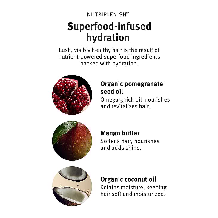 Superfood næringsstoffer til en plejet og synligt sundere hår. • fyldig og avanceret formel tilføjer masser af fugt• 96% naturlige ingredienser, * med SuperFood kompleks• Luksuriøs omega-5 økologisk granatæbleolie nærer tørt livløst hår • certificeret økologisk kokosolie med lav molekylevægt trænger nemt ind i håret og fugter • mangosmør fyldt med fedtsyrer nærer og efterlader håret blødt og glat • for tørt til meget tørt hår • Veganer • Spar penge og spar plastik, når de køber en liter.• Liter koster 10% mindre pr. ml • Liter bruges op til 28 % mindre plastik pr.liter