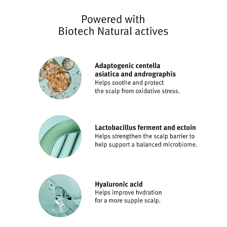 Biotech Naturals blanding af Lactobacillus Ferment og Ectoin, plus hyaluronsyre hjælper med at styrke og reparere hovedbundsbarrieren for at hjælpe med at understøtte et afbalanceret mikrobiom og hjælper med at forbedre hovedbundens fugtighed for en mere smidig hovedbund.