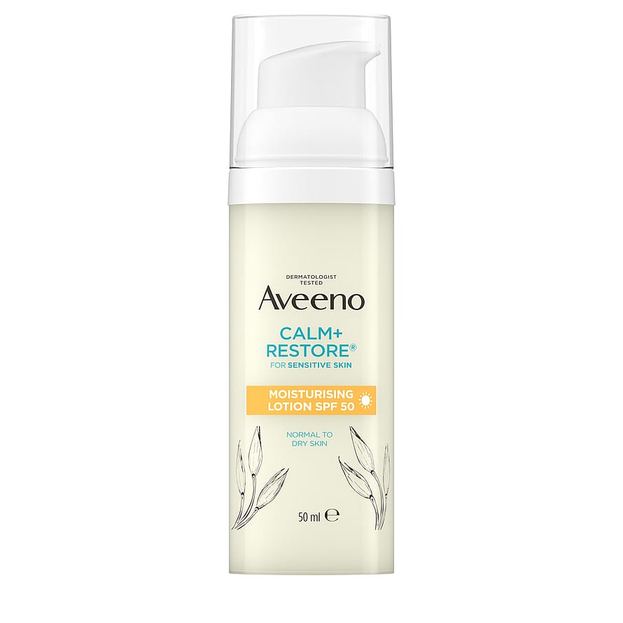Aveeno Calm+Restore Moisturising Lotion SPF50 er en parfumefri og let fugtighedscreme med SPF50 til daglig brug, som klinisk er bevist at intensivt fugte og berolige sensitiv hud, samtidig med at den beskytter mod solskader og forurening.