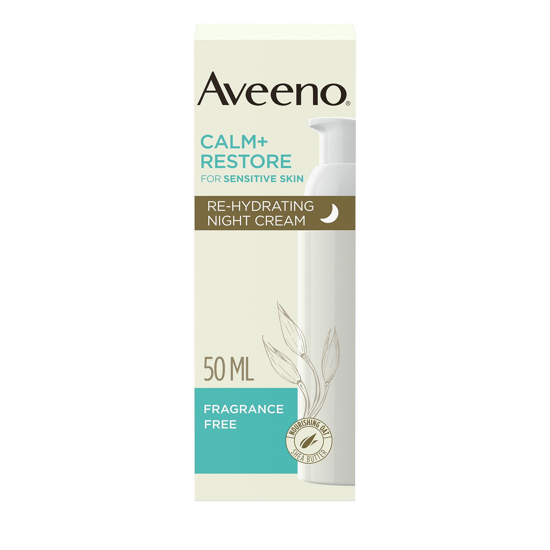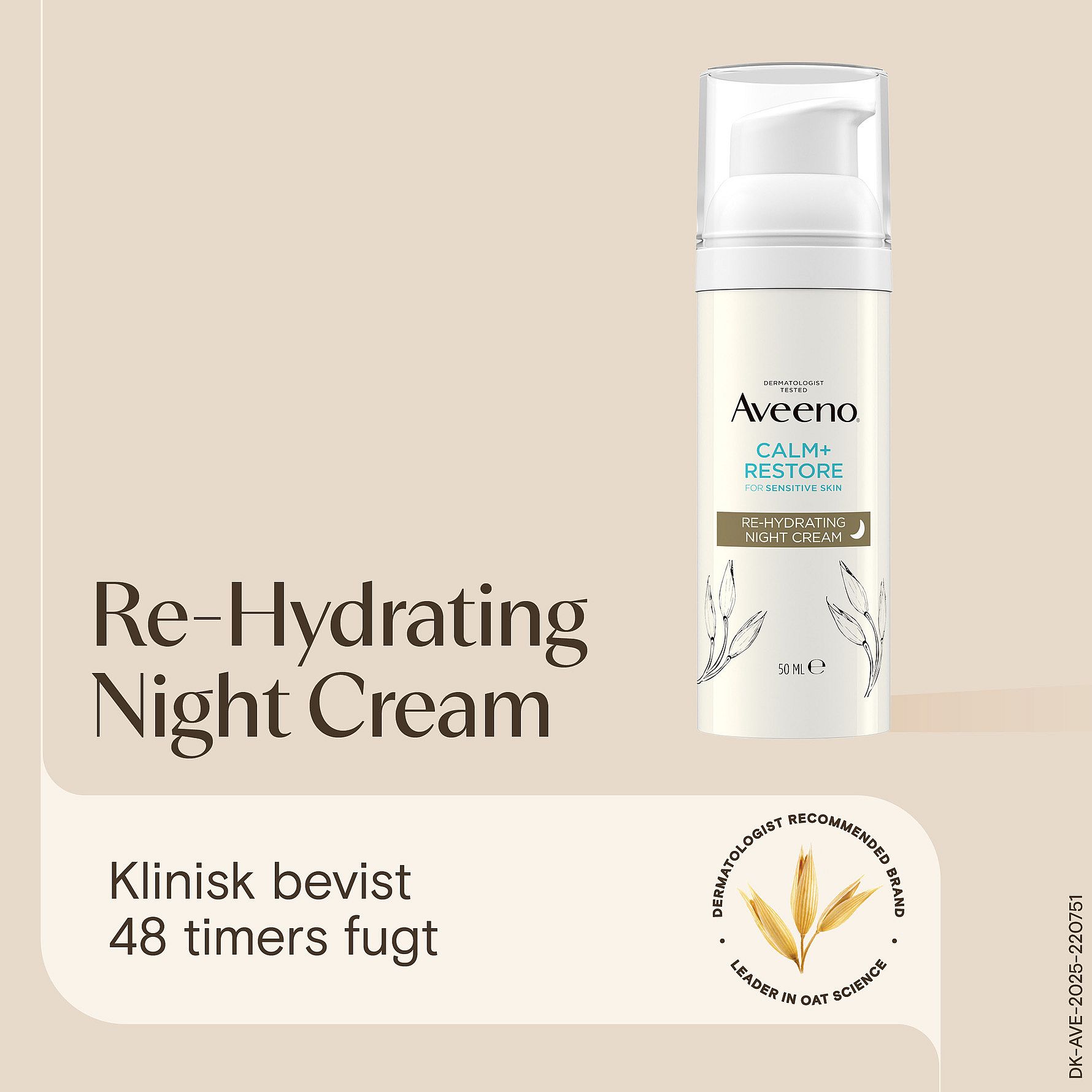 Giv huden intens fugt og styrk den beskyttende hudbarriere om natten med Aveeno CALM+RESTORE Re-Hydrating Night Cream. Den rige og fløjlsbløde natcreme giver intens fugt til sensitiv hud, og hjælper med at styrke og genoprette hudens fugtbarriere mens du sover for en beroliget hud om morgenen.