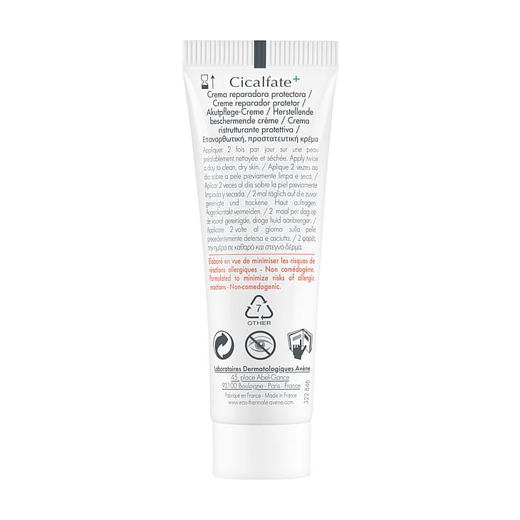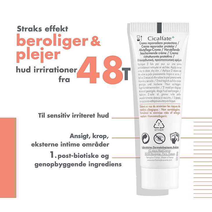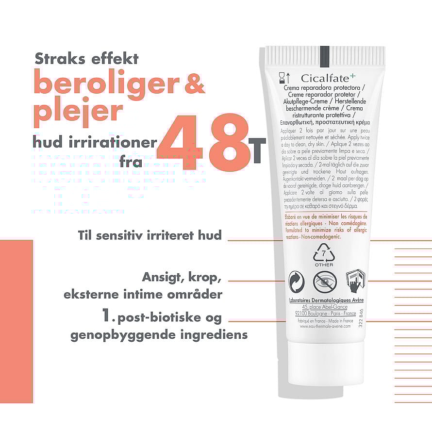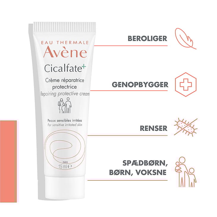 ProduktbeskrivelseAvène Cicalfate+ Repairing Protective Cream er en beroligende og genopbyggende creme, der er udviklet til sensitiv og irriteret hud hos både børn og voksne. Med sine genopbyggende* og rensende aktive ingredienser beroliger denne creme øjeblikkeligt ubehag i huden og fremmer genopbygningen* af sensitiv og irriteret hud.
