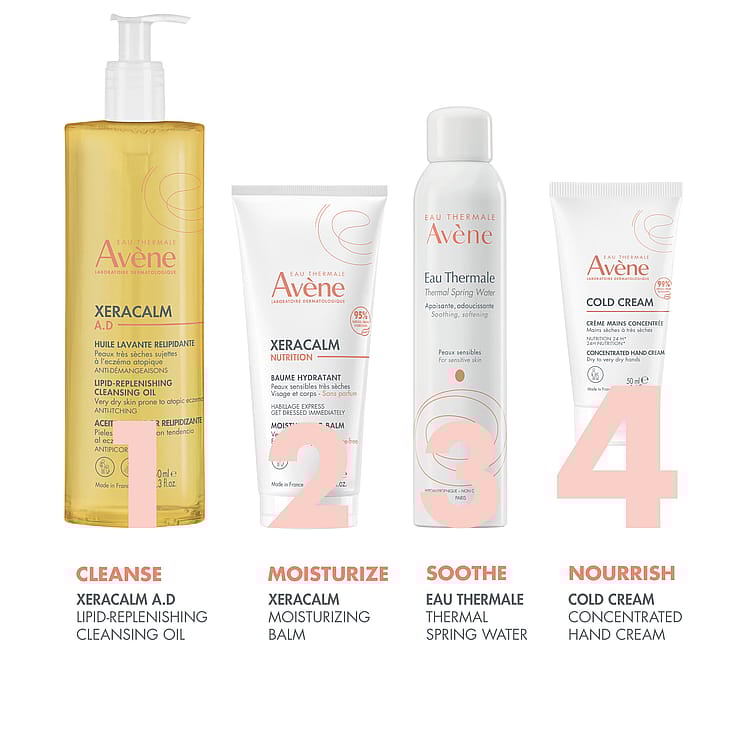 - Cold Cream: Traditionel blanding af ingredienser fra den franske farmakopé, bestående af voks, fedtstoffer og Avène Termalkildevand. Kompenserer for lipidmangel i den hydrolipide film og beskytter huden mod tørhed