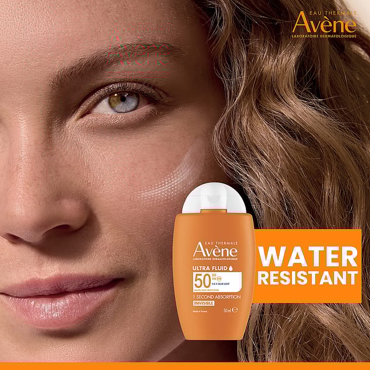 Avène Ultra Fluid Invisible SPF50 Face Suncare er en ultra-let solcreme til sensitiv hud i ansigt og på hals. Solcremen indeholder det patenterede TriAsorB™-filter, der giver huden meget høj og bred beskyttelse mod solens skadelige UVB- og UVA-stråler og højenergi blåt lys (HEV). Huden beskyttes mod forureningspartikler og fremskyndelse af hudens aldring.