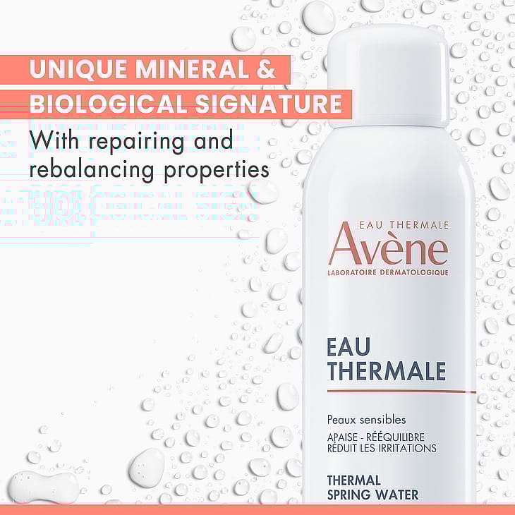 - Avène Termalkildevand: Naturligt kildevand med mineraler og silica. Beroliger, blødgør og rebalancerer huden