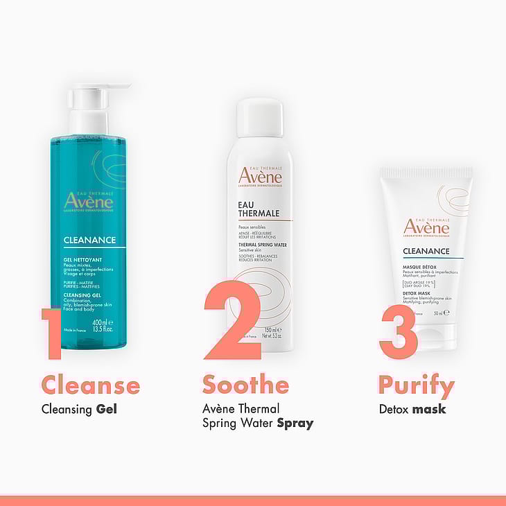- Avène Termalkildevand: Naturligt kildevand med mineraler og silica. Beroliger, blødgør og rebalancerer huden