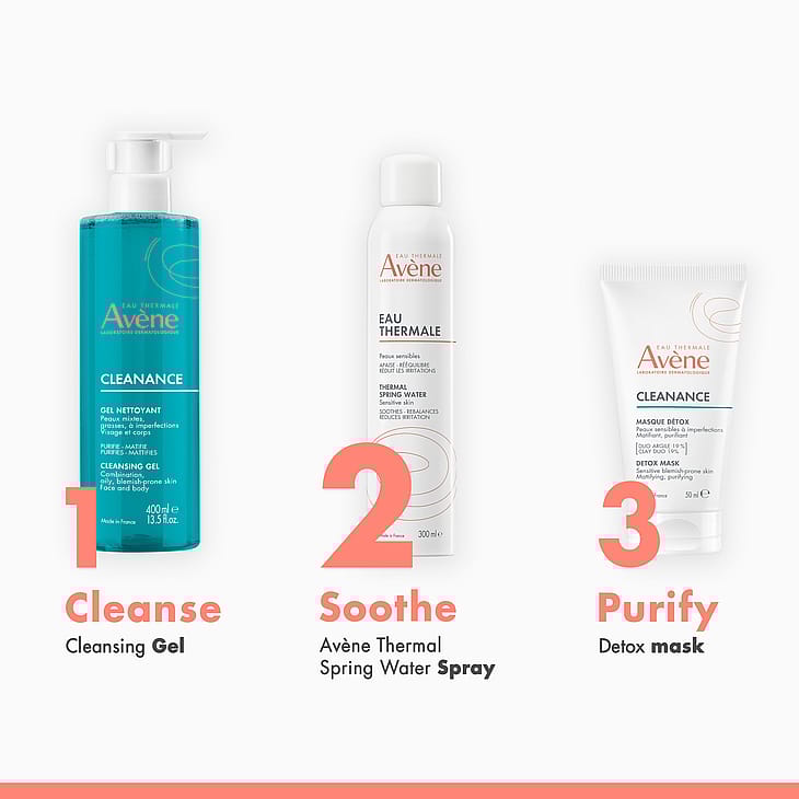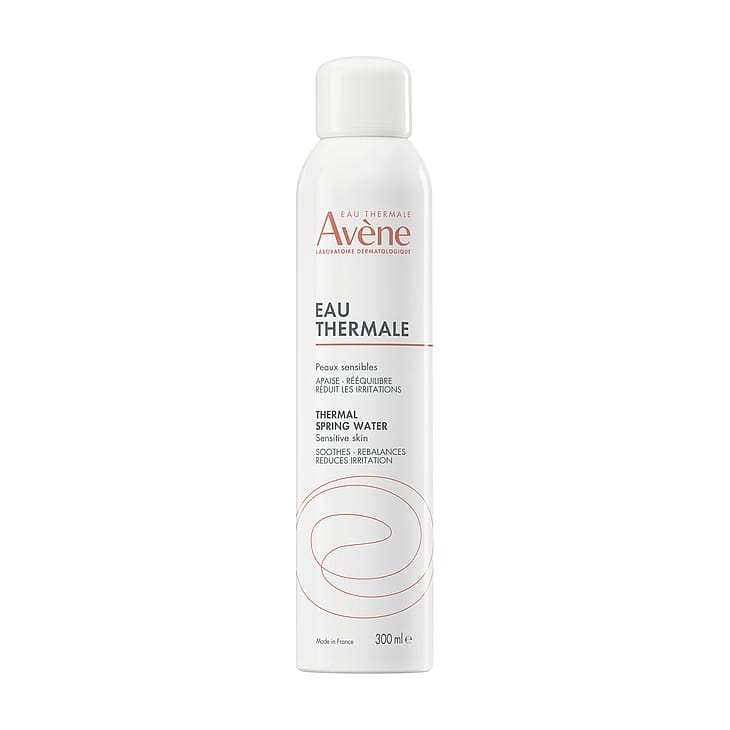 - Avène Termalkildevand: Naturligt kildevand med mineraler og silica. Beroliger, blødgør og rebalancerer huden
