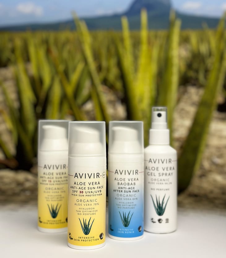 - Straks efter solbadning anbefaler vi at bruge AVIVIR Aloe Vera Gel Spray som mist, som straks køler, lindrer og genopbygger huden