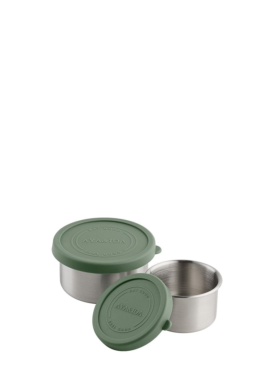 AYA&IDA Snack Containers er fremstillet i rustfri stål 18/8 med låg i blød og fleksibel silikone, som sikrer en tæt beholder og nem håndtering. Sættet består af 1 x 100ml og 1 x 200ml beholdere.