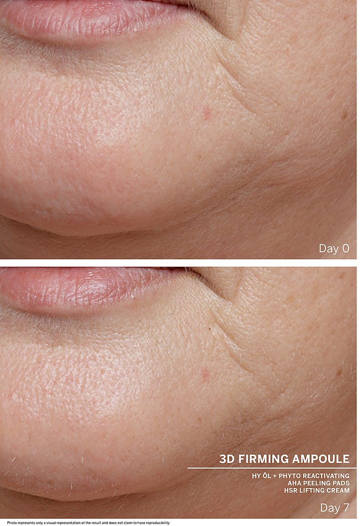 De aktive ingredienser i 3D Firming er med til at give huden mere fasthed samt udglatte og reducere synligheden af rynker. Ansigtskonturerne ser mere definerede ud efter regelmæssig brug, hvilket kan have en positiv effekt på hagelinjen. Resultater er mere definerede konturer.