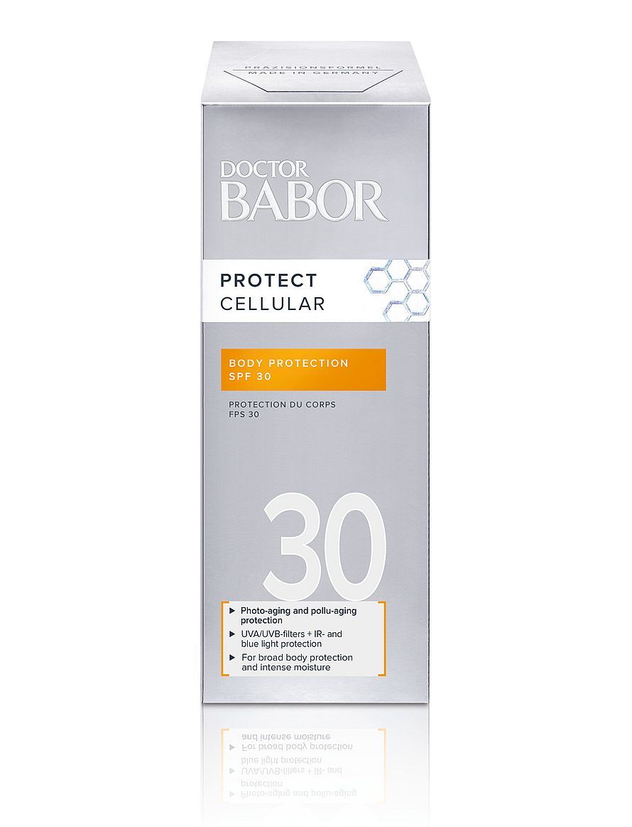 Bodylotion med SPF – hurtigtabsorberende lotion med SPF 30, der beskytter mod for tidlig, lysfremkaldt hudældning: beskyttelse mod UVA- + UVB- + IR-stråling og skader relateret til blåt lys samt bybeskyttelse mod radikaler fra fint støv.