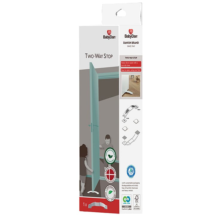 Dørstopperen er i en 100% bionedbrydelig emballage og er Cradle to Cradle certificeret. Det betyder, at emballagen vil blive nedbrudt naturligt, når du smider den ud, så den efterlader ingenting, som kunne skade vores planet. På den måde kan du beskytte din lille guldklump fra ulykker og tage ansvar for den verden, som dit barn vokser op i.
