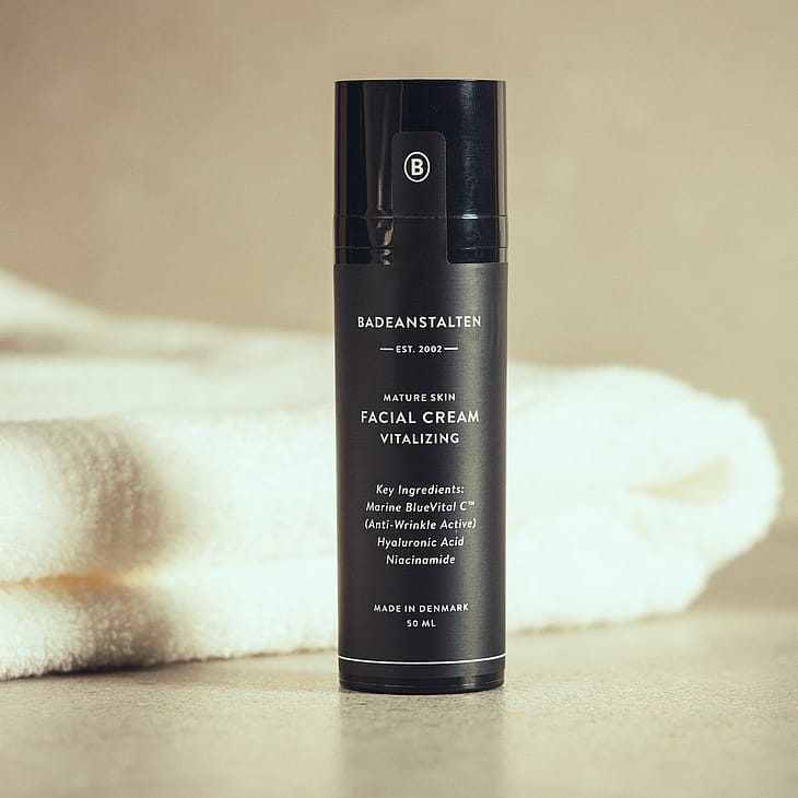 Vitaliserende ansigtscreme med et antirynke aktiv (Marine bluevital C) fremstillet af microalger, der stimulerer hudens kollagendannelse og mindsker rynker og fine linier.