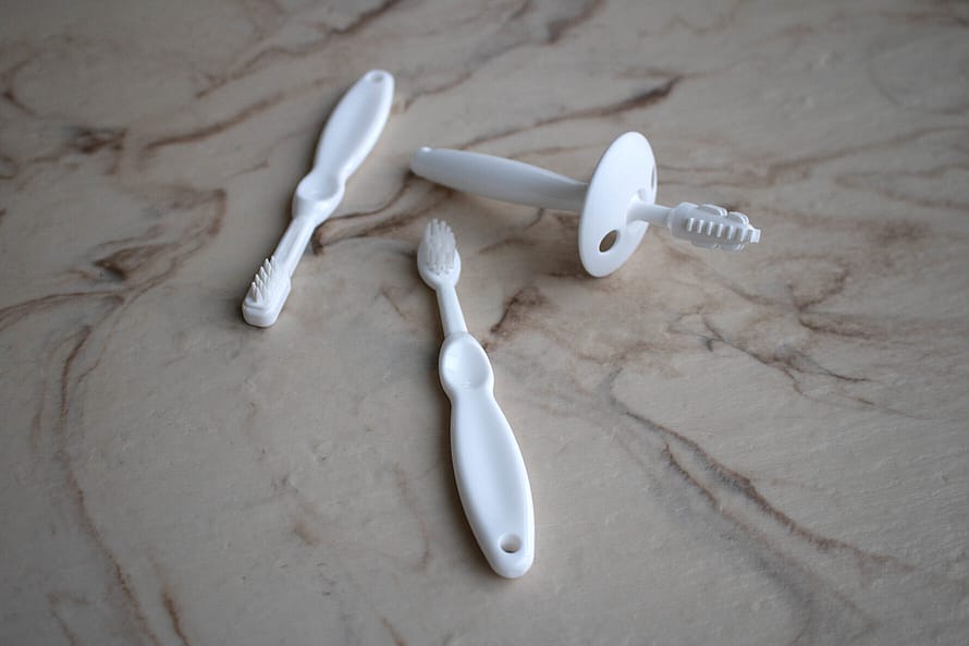 +12 mdr. tandbørsten er fortsat med i blødt gummi, og børster barnets første tænder blidt samtidig med at smerten lindres i de ømme gummer