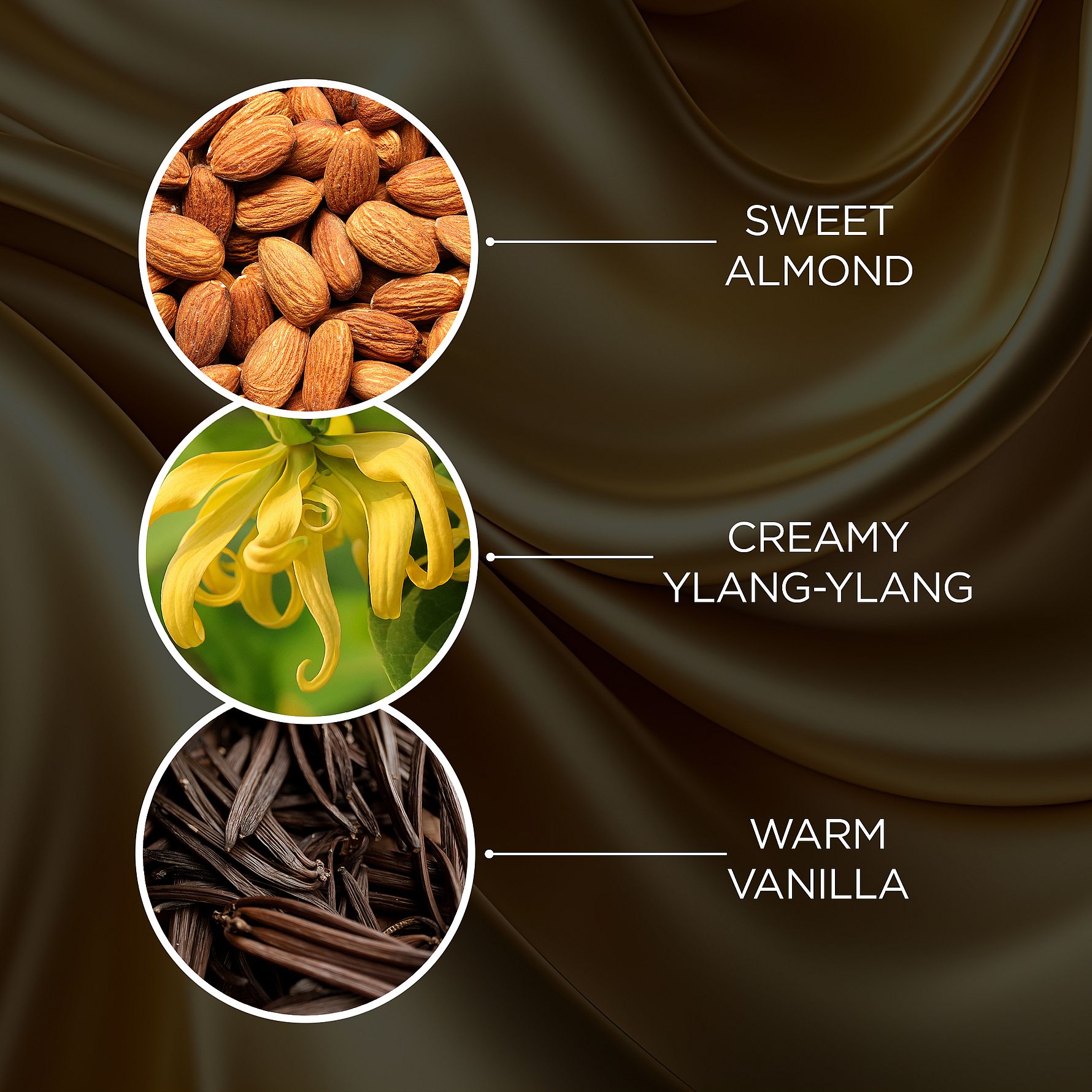Produkterne har et luksuriøst design der passer ind på et hvert badeværelse. En forførende duft, der begynder med varme noter fra mandel. Basen af vanilje, ylang, rav sandeltræ og moskus giver en cremet og sensuelt støtte.