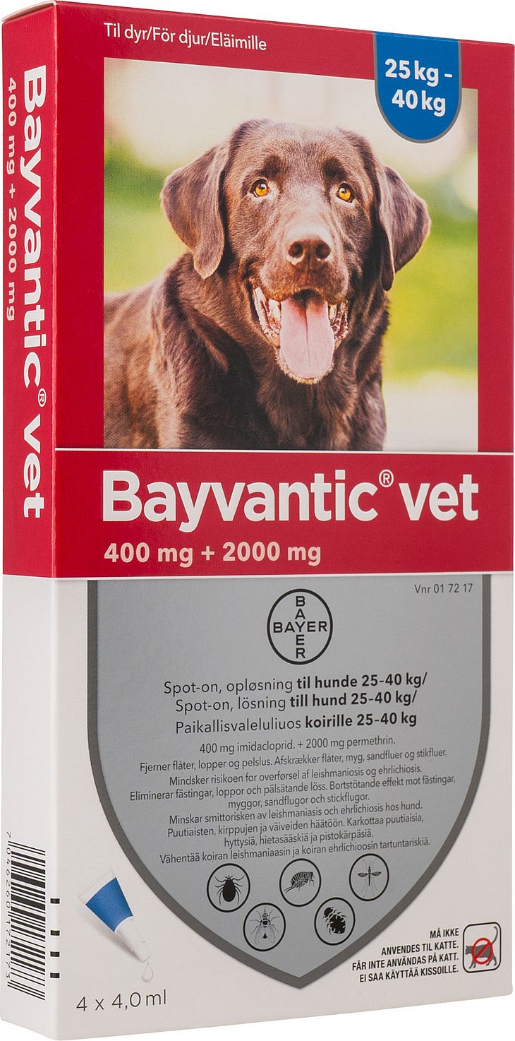 Minimum text – Enduser - Denmark Bayvantic® vet. spot-on, opløsning til hund. 1 ml indeholder 100 mg imidacloprid og 500 mg permethrin. Indikationer: Til behandling og forebyggelse af loppeangreb i 4 uger. Præparatet kan anvendes som en del af behandlings-strategien ved loppebetinget allergisk dermatit. Til behandling af pelslus. Præparatet har en vedvarende acaricid og repellerende (”antiblodsugende”) virkning mod visse flåtangreb i op til 4 uger. Reducerer sandsynligheden for ehrlichiosis fra dag 3 efter behandling og op til 4 uger. Det anbefales at fjerne flåter, inden behandling foretages. En behandling har repellerende virkning på sandfluer i op til 3 uger, på myg i op til 4 uger og på almindelige stikfluer i 4 uger. Reducerer risikoen for infektion med leishmania infantum fra sandfluer i op til 3 uger. Det er en indirekte effekt, der skyldes produktets virkning på sandfluen (vektoren).Kontraindikationer: Må ikke anvendes til katte. Hvalpe under 7 uger og 1,5 kg bør ikke behandles. Bør ikke anvendes i tilfælde af overfølsomhed over for de aktive stoffer eller et eller flere af hjælpestofferne. Advarsler og forsigtighedsregler: Må ikke anvendes til katte, da det er særdeles giftigt for dem. Katte må ikke slikke på den behandlede hunds påføringssted. Søg straks dyrlæge. Tillad ikke nyligt behandlede hunde at slikke på hinanden. Undgå at pipettens indhold kommer i kontakt med øjne eller mund på hunden. Hunde der behandles for at reducere risikoen for infektion med Leishmania infantum via sandfluer, bør holdes i et beskyttet miljø de første 24 timer efter første dosis er påført. Rådfør med dyrlægen før syge og svækkede hunde behandles. Behandlede dyr bør omgås med forsigtighed indtil påføringsstedet er tørt. Nyligt behandlede dyr bør ikke gives lov til at sove sammen med deres ejere/husets børn. Indtag ikke præparatet. Vask hænderne grundigt efter brug. Præparatet er skadeligt for organismer i vandet og behandlede dyr bør ikke komme i kontakt med overfladevand de første 48 timer. Opløsningsmidlet i Bayvantic kan forårsage pletter på visse materialer, så lad derfor væsken tørre inden kontakt. For yderligere information læs indlægssedlen.Følgende er kun gældende for produkter til hunde der vejer mere end 10 kg.Veterinærlægemidlet bør ikke administreres af gravide kvinder eller kvinder der potentielt kan være gravide. Kvinder i den fødedygtige alder bør anvende personlige værnemidler bestående af handsker ved håndtering af veterinærlægemidlet.Bivirkninger: Kløe og påvirkning af pels (f.eks. fedtet pels) på påføringsstedet samt opkastning. I sjældne tilfælde er reaktioner som rødmen, inflammation og hårtab på påføringsstedet samt diarre. I meget sjældne tilfælde er forbigående hudreaktioner (f.eks. kløe, kradsen og gniden) og sløvhed set. Disse reaktioner forsvinder normalt af sig selv. Hundene kan vise adfærdsændring, mave-tarm symptomer og neurologiske reaktioner, hvis hunden er følsom overfor permethrin. Symptomerne er normalt forbigående og kræver ingen behandling.Drægtighed og diegivning: Kan anvendes under drægtighed og laktation. Interaktioner: Ingen kendteDosering: Kun til brug på huden. Hunde > 1,5 = 4 kg: 1 pipette a 0,4 ml; > 4 kg = 10 kg: 1 pipette a 1,0 ml; > 10 kg = 25 kg: 1 pipette a 2,5 ml; > 25 kg = 40 kg: 1 pipette a 4,0 ml; >40 kg = 60 kg: 1 pipette a 6,0 ml. Til hunde > 60 kg bruges en passende kombination af pipetter. Opløsningen fordeles på huden af ryggen fra skulderbladene til haleroden. Skal hunden vaskes med shampoo gøres dette før påføring af Bayvantic eller mindst 2 uger efter. Behandles mod pelslus bør dyrlægen kontrollere effekten efter 30 dage, da en yderligere dosis kan være nødvendig. For beskyttelse i hele sæsonen for sandfluer bør behandlingen omhyggeligt fortsættes i hele perioden.Pakningsstørrelser: pakninger med 4 pipetter á: 0,4 ml (hunde op til 4 kg) – 1,0 ml (hunde på 4-10 kg) – 2,5 ml (hunde på 10-25 kg) – 4,0 ml (hunde på 25-40 kg) – 6,0 ml (hunde på 40-60 kg). LÆS INDLÆGSSEDLEN FØR BRUGSenest ændret: 04-07-2023Forhandles af: Elanco Denmark ApS, Lautrupvang 12, 2750 Ballerup. Telefon 4526 6060DKmiADX0723u