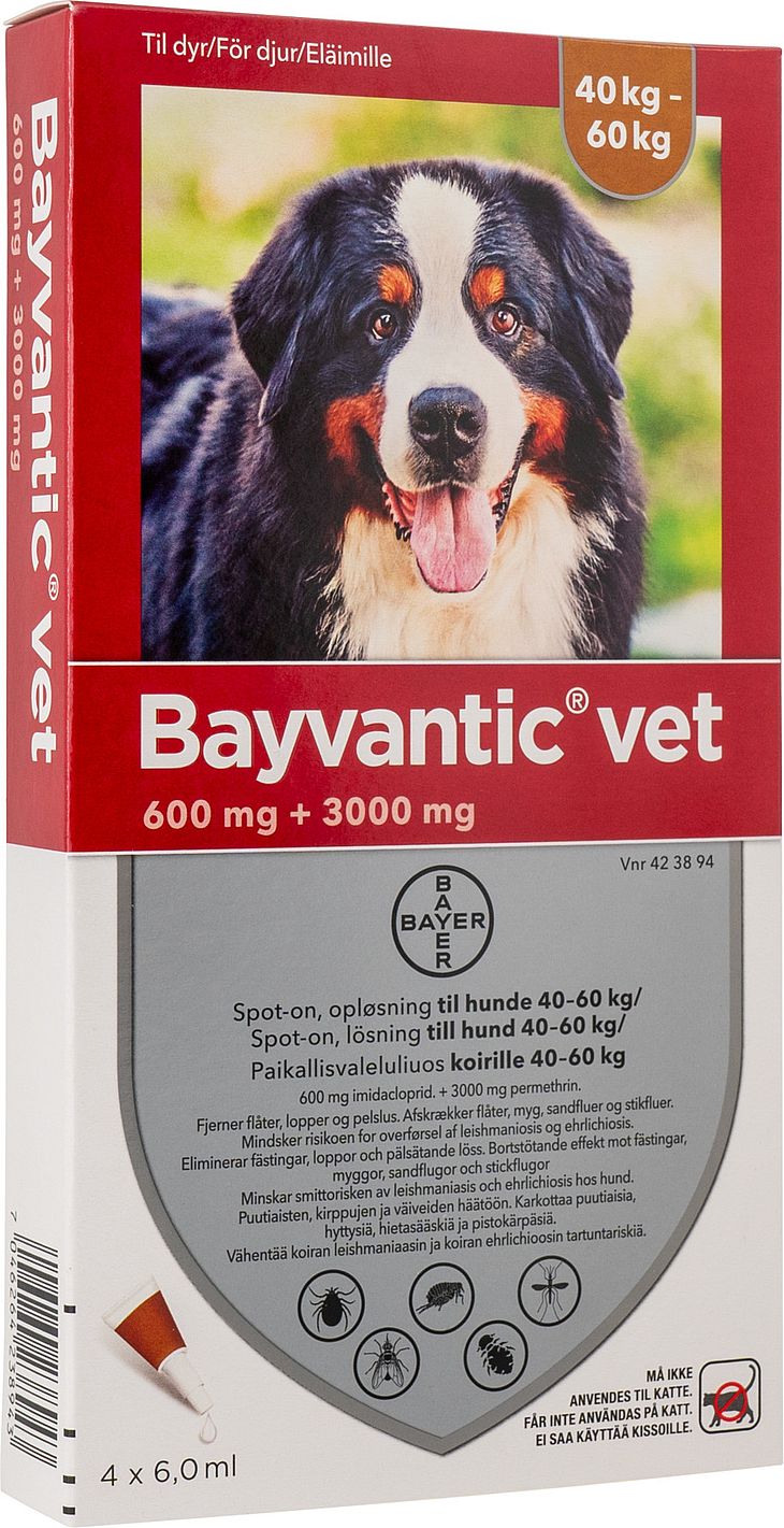Minimum text – Enduser - Denmark Bayvantic® vet. spot-on, opløsning til hund. 1 ml indeholder 100 mg imidacloprid og 500 mg permethrin. Indikationer: Til behandling og forebyggelse af loppeangreb i 4 uger. Præparatet kan anvendes som en del af behandlings-strategien ved loppebetinget allergisk dermatit. Til behandling af pelslus. Præparatet har en vedvarende acaricid og repellerende (”antiblodsugende”) virkning mod visse flåtangreb i op til 4 uger. Reducerer sandsynligheden for ehrlichiosis fra dag 3 efter behandling og op til 4 uger. Det anbefales at fjerne flåter, inden behandling foretages. En behandling har repellerende virkning på sandfluer i op til 3 uger, på myg i op til 4 uger og på almindelige stikfluer i 4 uger. Reducerer risikoen for infektion med leishmania infantum fra sandfluer i op til 3 uger. Det er en indirekte effekt, der skyldes produktets virkning på sandfluen (vektoren).Kontraindikationer: Må ikke anvendes til katte. Hvalpe under 7 uger og 1,5 kg bør ikke behandles. Bør ikke anvendes i tilfælde af overfølsomhed over for de aktive stoffer eller et eller flere af hjælpestofferne. Advarsler og forsigtighedsregler: Må ikke anvendes til katte, da det er særdeles giftigt for dem. Katte må ikke slikke på den behandlede hunds påføringssted. Søg straks dyrlæge. Tillad ikke nyligt behandlede hunde at slikke på hinanden. Undgå at pipettens indhold kommer i kontakt med øjne eller mund på hunden. Hunde der behandles for at reducere risikoen for infektion med Leishmania infantum via sandfluer, bør holdes i et beskyttet miljø de første 24 timer efter første dosis er påført. Rådfør med dyrlægen før syge og svækkede hunde behandles. Behandlede dyr bør omgås med forsigtighed indtil påføringsstedet er tørt. Nyligt behandlede dyr bør ikke gives lov til at sove sammen med deres ejere/husets børn. Indtag ikke præparatet. Vask hænderne grundigt efter brug. Præparatet er skadeligt for organismer i vandet og behandlede dyr bør ikke komme i kontakt med overfladevand de første 48 timer. Opløsningsmidlet i Bayvantic kan forårsage pletter på visse materialer, så lad derfor væsken tørre inden kontakt. For yderligere information læs indlægssedlen.Følgende er kun gældende for produkter til hunde der vejer mere end 10 kg.Veterinærlægemidlet bør ikke administreres af gravide kvinder eller kvinder der potentielt kan være gravide. Kvinder i den fødedygtige alder bør anvende personlige værnemidler bestående af handsker ved håndtering af veterinærlægemidlet.Bivirkninger: Kløe og påvirkning af pels (f.eks. fedtet pels) på påføringsstedet samt opkastning. I sjældne tilfælde er reaktioner som rødmen, inflammation og hårtab på påføringsstedet samt diarre. I meget sjældne tilfælde er forbigående hudreaktioner (f.eks. kløe, kradsen og gniden) og sløvhed set. Disse reaktioner forsvinder normalt af sig selv. Hundene kan vise adfærdsændring, mave-tarm symptomer og neurologiske reaktioner, hvis hunden er følsom overfor permethrin. Symptomerne er normalt forbigående og kræver ingen behandling.Drægtighed og diegivning: Kan anvendes under drægtighed og laktation. Interaktioner: Ingen kendteDosering: Kun til brug på huden. Hunde > 1,5 = 4 kg: 1 pipette a 0,4 ml; > 4 kg = 10 kg: 1 pipette a 1,0 ml; > 10 kg = 25 kg: 1 pipette a 2,5 ml; > 25 kg = 40 kg: 1 pipette a 4,0 ml; >40 kg = 60 kg: 1 pipette a 6,0 ml. Til hunde > 60 kg bruges en passende kombination af pipetter. Opløsningen fordeles på huden af ryggen fra skulderbladene til haleroden. Skal hunden vaskes med shampoo gøres dette før påføring af Bayvantic eller mindst 2 uger efter. Behandles mod pelslus bør dyrlægen kontrollere effekten efter 30 dage, da en yderligere dosis kan være nødvendig. For beskyttelse i hele sæsonen for sandfluer bør behandlingen omhyggeligt fortsættes i hele perioden.Pakningsstørrelser: pakninger med 4 pipetter á: 0,4 ml (hunde op til 4 kg) – 1,0 ml (hunde på 4-10 kg) – 2,5 ml (hunde på 10-25 kg) – 4,0 ml (hunde på 25-40 kg) – 6,0 ml (hunde på 40-60 kg). LÆS INDLÆGSSEDLEN FØR BRUGSenest ændret: 04-07-2023Forhandles af: Elanco Denmark ApS, Lautrupvang 12, 2750 Ballerup. Telefon 4526 6060DKmiADX0723u
