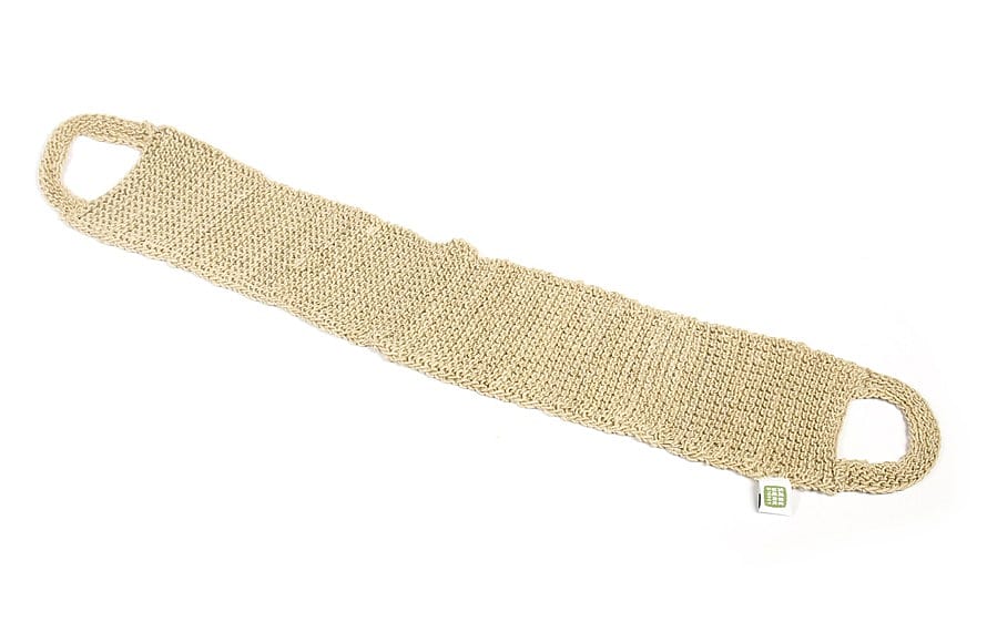 Hampstroppen er ideel til at skrubbe de døde hudceller bort og stimulere blodcirkulationen, også på ryggen, hvor det ellers kan være svært at nå. Stroppen kan anvendes såvel tør som våd. Vore håndstrikkede hampprodukter har vi hentet fra Bangladesh. Vi handler med en organisation, der skaber job til kvinder, til en rimelig løn. Projektet er i efteråret 2016 blevet Fairtrade certificeret. Hampprodukterne er alle af høj kvalitet, både hvad angår udførelse og materiale. Hamp dyrkes i stor stil i Bangladesh, og det er velegnet til denne slags produkter. Materialet er stærkt og giver et godt skrub uden at ridse eller skade huden. Hamp er et rigtig godt materiale at bruge til svampe, som man tager med sig i badet. Materialet er stærkt og giver et godt skrub uden at ridse eller skade huden. Dimensioner: ca. 51 x 10 cm.