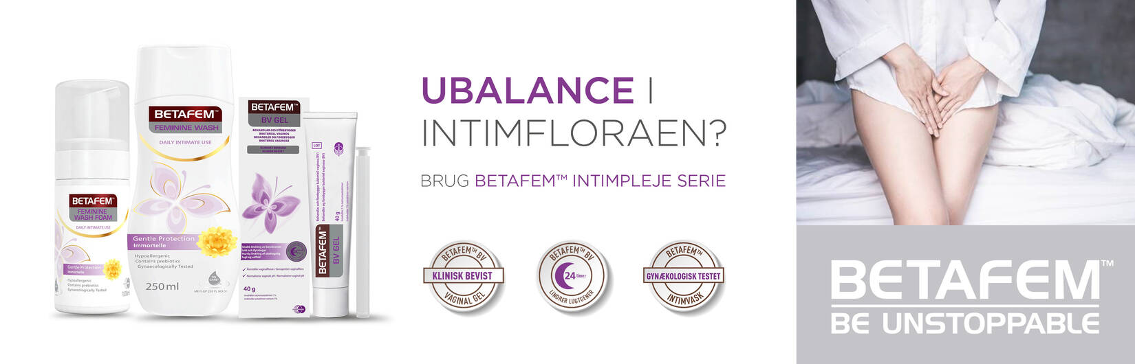 1 ud af 3 kvinder oplever at få bakteriel vaginose mindst én gang i livet. Betafem intimpleje-serie er udviklet til at forebygge og behandle symptomerne.