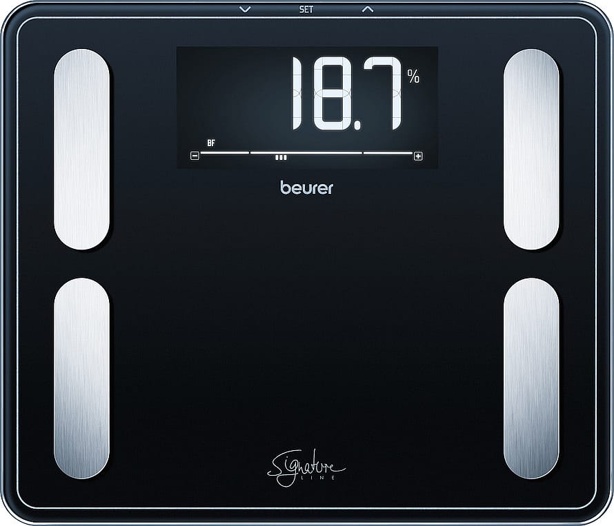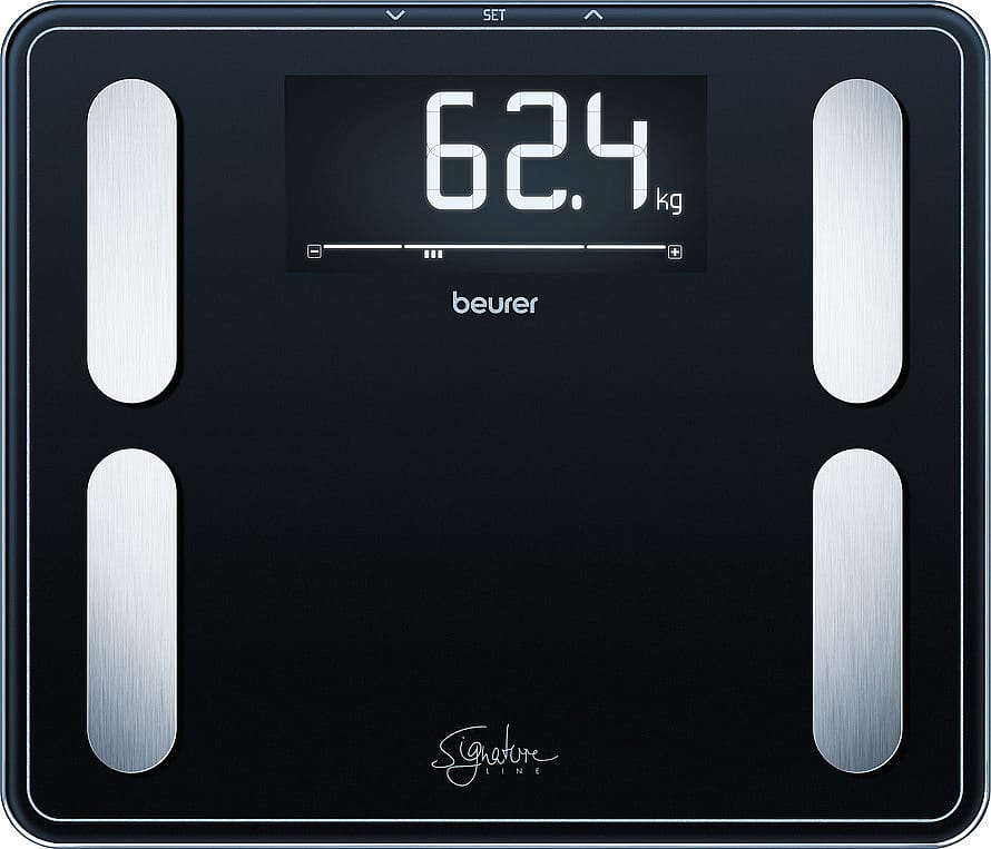 Den sorte kropsanalysevægt BF 410 er en del af Beurer Signature Line, som består af en række personvægte, der alle har Beurers egen font i displayet og alle med en ekstra høj vejekapacitet på 200 kg.