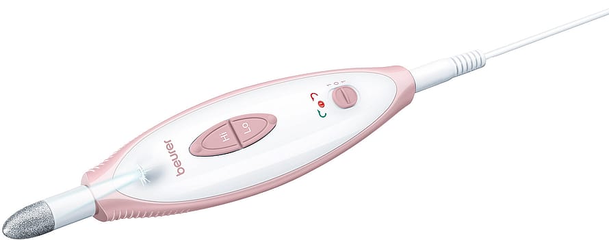 ADVARSEL• Dette apparat kan anvendes af børn fra 8 år ogderover samt af personer med nedsat fysisk,sensorisk eller mental funktionsevne ellermangel på erfaring og viden, hvis de er underopsyn eller er blevet undervist i sikker brugaf apparatet og forstår de dermed forbundnefarer.• Børn må ikke lege med apparatet.• Rengørings- og brugervedligeholdelse må ikkeudføres af børn, medmindre de er under opsyn.• Använd inte produkten om den har synliga skadoreller inte fungerar som den ska. Kontakta isådana fall kundtjänst.• Reparationer får endast utföras av vår kundtjänsteller av auktoriserade återförsäljare.• Hvis el-ledningen til dette apparat bliver beskadiget,skal den bortskaffes. Hvis den ikke kantages af, skal apparatet bortskaffes.OBS:Der kan under brugen ske en kraftig varmeudvikling på huden eller neglene.Vær opmærksom på når den anvendes, at ingen hår indfanges af de roterendeopsatser. Hav for en sikkerhedsskyld et hårbånd på.– Kontrollér resultaterne regelmæssigt under behandlingen. Dette gælderisær for diabetikere, da de er mindre følsommer overfor smerte, så derlettere kan opstå kvæstelser. De medleverede påsætningsenheder 1, 2,3, 4 og 5 er principielt egnede til brug for diabetikere, da de kun tjenertil behandling af overfladebehandlinger og ikke punktuelle behandlinger.Påsætningsenhederne E, F og G er derimod mindre egnede til diabetikere.Arbejd altid meget forsigtigt. Spørg din læge, hvis du er i tvivl.– Dette apparat må kun anvendes til det formål, som det er udviklet til, ogpå den måde, som er beskrevet i betjeningsvejledningen. Enhver ukorrektanvendelse kan være farlig.– Ved langvarig intensiv anvendelse af apparatet, f.eks. ved afslibning afhård hud på fodsålerne, kan apparatet bliver kraftigt opvarmet. For at undgåhudforbrændinger i denne forbindelse, skal der holdes længere pauserimellem de enkelte anvendelser. Kontrollér for Deres egen sikkerhedsskyld til stadighed varmeudviklingen af apparatet. Dette gælder især forpersoner, der er ufølsomme overfor varme.– Apparatet er kun beregnet til privat brug og ikke til hverken medicinskeller kommerciel brug.– Het apparaat mag om hygiënische redenen slechts bij één persoon gebruiktworden.– Producenten hæfter ikke for skader, der er forårsaget af uhensigtsmæssigeller forkert anvendelse.– Hold børn væk fra emballagen. Der er fare for kvælning.– Apparatet skal ofte kontrolleres for tegn på slitage eller beskadigelse.Hvis der konstateres sådanne tegn eller hvis apparatet er blevet anvendtuhensigtsmæssigt, skal det indleveres til producenten eller forhandleren,inden det bruges igen.– Sluk straks apparatet i tilfælde af defekter og driftsforstyrrelser.– Reparationer må kun udføres af vores kundeservice eller autoriseredeforhandlere.– Forsøg aldrig selv at reparere apparatet!– Brug kun apparatet med de medleverede tilbehørsdele.– Lad aldrig apparatet være i drift uden opsyn, især hvis der er børn i nærheden.– Må ikke anvendes på mindre husdyr/dyr.5– Undgå enhver kontakt med vand (bortset fra ved rengøring med en let fugtig klud!). Der må aldrig komme vand ind i apparatets indre. Dyp aldrig apparatet ned i vand. Du må under ingen omstændigheder bruge apparatet i badekarret, i brusebadet, i svømmebassinet eller over en vask fyldt med vand. Hvis der alligevel er trængt vand ind i huset, skal du straks afbryde apparatet fra lysnettet og henvende dig til el-forhandleren eller vores kundeservice.– Hold apparatet væk fra varmekilder.– Brug ikke apparatet under tæpper, puder m.m.– Apparatet må ikke bruges uafbrudt i mere end 20 minutter. Efter denne tid skal der være en pause på mindst 15 minutter for at undgå en overophedning af motoren.– Hænderne skal altid være tørre, når du benytter apparatet eller lysnetadapteren.– Træk ikke i lysnetledningen eller i apparatet for at trække lysnetadapteren ud af stikkontakten.– Lysnetadapteren må kun tilsluttes den netspænding, der er angivet på den.– Apparatet må kun anvendes med den medfølgende lysnetadapter.– Efter hver brug, før hver rengøring og før hver udskiftning af tilbehør skal lysnetadapteren hele tiden være taget ud af stikket.Anvendelse3.1 Generelt– Dette apparat er kun beregnet til behandling af hænderne (manicure) og fødderne (pedicure).– Husk for inden at slukke apparatet.– Vælg den ønskede påsætningsdel og sæt den på apparatets aksel med et let tryk. Påsætningsenheden tages af ved at trække påsætningsenheden og apparatet fra hinanden i lige retning.– Tænd apparatet ved at bevæge skydekontakten nedad (venstreløb, LED‘en lyser rødt) eller opad (højreløb, LED‘en lyser grønt).6– Der kan vælges mellem to hastighedstrin (Hi og Lo). Tryk på den passende knap på apparatet.– Alle file- og slibe-påsætningsenheder er udstyret med en bekægning af safirkorn. Denne belægning garanterer en meget lang levetid og bliver næsten ikke slidt.– Undlad at bruge tryk og før altid påsætningsenhederne forsigtigt hen til den overflade, der skal bearbejdes.– Før langsomt apparatet hen over de partier, der skal bearbejdes, med et let tryk og i cirklende bevægelser.– Vær opmærksom på, at de slibende påsætningsenheder har en reduceret virkning på blødgjort eller fugtig hud. Af denne grund anbefaler vi, at du ikke foretager nogen forbehandling i et vandbad.– For at bibeholde hudens naturlige beskyttelse må du ikke fjerne hele den hårde hud.– Sørg for, at akslen altid kan dreje frit. Akslen må ikke være permanent blokeret, ellers bliver apparatet for varmt og dermed beskadiget.– Smør altid en fugtighedscreme på de behandlede partier efter brugen.Vigtigt:Kontrollér resultaterne regelmæssigt under behandlingen. Dette gælder især for diabetikere, da deres hænder og fødder er mindre følsomme.3.2 PåsætningsenhederDa det drejer sig om profi-påsætningeenheder, bedes du håndere di