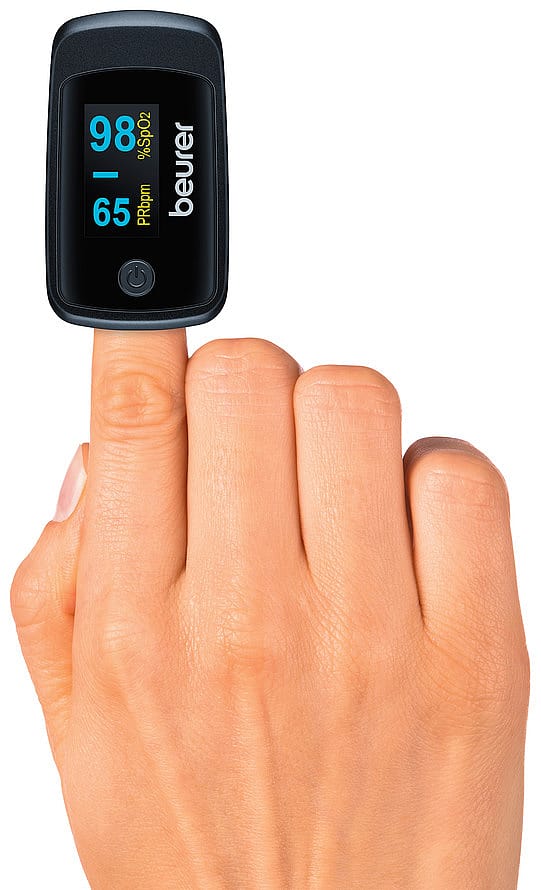 ADVARSEL• Kontrollér, om alle dele er med.• Kontrollér pulsoximetret regelmæssigt for at sikre, at apparatet før brugen ikke harnogen skader, og at batterierne fortsat er tilstrækkeligt opladet. Anvend ikke apparatet itvivlstilfælde, og kontakt Beurers kundeservice eller en autoriseret forhandler.• Anvend ikke tilbehørsdele, som ikke er anbefalet af producenten, eller som ikke tilbydessom tilbehør.• Apparatet må under ingen omstændigheder åbnes eller repareres, da en fejlfri funktionellers ikke længere kan garanteres. Overholdes dette ikke, bortfalder garantien. Henvenddig til Beurers kundeservice eller en autoriseret forhandler, hvis der er brug for reparation.Anvend− IKKE pulsoximetret, hvis du reagerer allergisk på gummiprodukter.− IKKE pulsoximetret, hvis apparatet eller den anvendte finger er fugtig.− IKKE pulsoximetret til småbørn eller babyer.− IKKE pulsoximetret under en MRT- eller CT-undersøgelse.− IKKE pulsoximetret under patienttransport uden for klinikken.− IKKE pulsoximetret under en blodtryksmåling på siden af armen med brug af manchet.IKKE pulsoximetret på fingre med neglelak, tilsmudsninger eller områder forsynet medplaster.− IKKE pulsoximetret på fingre med stor omkreds, som ikke kan føres ind i apparatetuden tvang (fingerspids: bredde ca. > 20 mm, tykkelse ca. > 15 mm).− IKKE pulsoximetret på fingre med anatomiske forandringer, ødemer, ar eller forbrændinger.− IKKE pulsoximetret på fingere med for lille omkreds, såsom ved småbørn (bredde ca.< 10 mm, tykkelse ca. < 5 mm).− IKKE pulsoximetret på patienter, som er urolige (f.eks. rystelser).− IKKE pulsoximetret i nærheden af brændbare eller eksplosive gasblandinger.• Ved personer med blodomløbsforstyrrelser kan længerevarende anvendelse af pulsoximetretmedføre smerter. Anvend derfor ikke pulsoximetret i længere tid end 30 minutterpå én finger. Ellers kan det ikke garanteres, at sensorindstillingen er korrekt, og at hudenforbliver ubeskadiget.• Pulsoximetret viser til enhver tid en øjebliksværdi, men kan ikke anvendes til kontinuerligovervågning.• Pulsoximetret har ingen alarmfunktion og egner sig derfor ikke til vurdering af medicinskeresultater.• Stil ikke selv nogen diagnose, og foretag ikke selv nogen behandling på grundlag af måleresultaterneuden samråd med din behandlende læge. Påbegynd i særdeleshed ikkeselv nogen ny medicinering, og foretag ingen ændringer i måden og / eller doseringen afen bestående medicinering.• Kig ikke direkte ind i huset under målingen. Pulsoximetrets røde lys og usynlige infrarødelys er skadeligt for øjnene.• Det bærbare RF-kommunikationsudstyr (inklusive perifere enheder såsom antennekablerog eksterne antenner) bør ikke bruges nærmere 30 cm til nogen del af PO 45. Ellers kandet resultere i en nedbrydning af udstyrets ydeevne.• Pulsoximeteret er kalibreret til at vise funktionel iltmætning.• Dette apparat er ikke beregnet til at blive brugt af personer (herunder børn) medbegrænsede fysiske, sensoriske eller mentale evner eller manglende erfaring og/ellerviden, medmindre de er under opsyn af en anden person, der har ansvaret for deressikkerhed, eller som giver dem anvisninger på, hvordan apparatet skal bruges. Børn børvære under opsyn, så de ikke leger med apparatet.• Hverken visning af pulskurven eller af pulssøjlen giver mulighed for at foretage nogenvurdering af pulsens eller blodgennemstrømningens styrke på målestedet, men kanudelukkende anvendes til at vise den aktuelle optiske signalvariation på målestedet;demuliggør ikke nogen sikker pulsdiagnose.MÅLERESULTAT SpO2 (ILTMÆTNING) I %99-94 - normalområde93-90 - nedsat område: Det anbefales at søge læge< 90 - kritisk område: vigtigt at søge lægeRengøring / VedligeholdelseOBS:Anvend aldrig højtryks- eller ethylenoxidsterilisation på pulsoximetret!Apparatet er ikke beregnet til sterilisation.Pulsoximetret må aldrig holdes under vand, da væsken ellers kan trænge ind i ogbeskadige pulsoximetret.• Rengør huset og den gummibelagte indvendige overflade af pulsoximetret hver gangefter brug med en blød klud fugtet med medicinsk alkohol.• Hvis der vises en lav batteritilstand på pulsoximetrets display, skal batterierne udskiftes.• Hvis du ikke skal bruge pulsoximetret i mere end en måned, skal du tage begge batterierud af apparatet for at forhindre, at batterierne eventuelt lækker.11. OpbevaringOBS:Opbevar pulsoximetret på et tørt sted (relativ luftfugtighed ≤ 93 %). En for høj luftfugtighedkan forkorte pulsoximetrets levetid eller medføre beskadigelser. Opbevar pulsoximetret pået sted, hvor den omgivende temperatur ligger mellem -25 °C og 70 °C.Anvisninger vedr. elektromagnetisk kompatibilitetADVARSEL• Apparatet egner sig til brug i alle omgivelser, der er anført i denne betjeningsvejledning,herunder også private boliger.• I nærheden af elektromagnetisk interferens kan apparatets funktion være nedsat. Dettekan eksempelvis forårsage fejlmeddelelser eller svigt af skærmen/apparatet.• Dette apparat bør ikke anvendes lige ved siden af andre apparater eller stablet medandre apparater, da det kan forårsage forstyrrelser af og fejl i forbindelse med brugenaf apparatet. Hvis det er nødvendigt at anvende apparatet på ovenstående måde, skaldette apparat og de andre apparater overvåges for at sikre, at de fungerer som de skal.• Brug af andet tilbehør end det, som producenten af dette apparat har fastlagt ellerleveret, kan forårsage øget udsendelse af elektrisk interferens eller forringe apparatetselektromagnetiske immunitet, og det kan medføre forstyrrelser af eller fejl i forbindelsemed brugen af apparatet.• Manglende overholdelse heraf kan forårsage en forringelse af apparatets funktionsegenskaber.