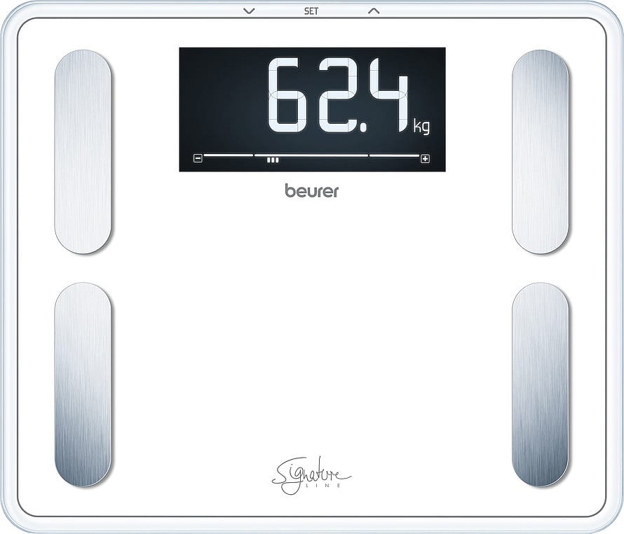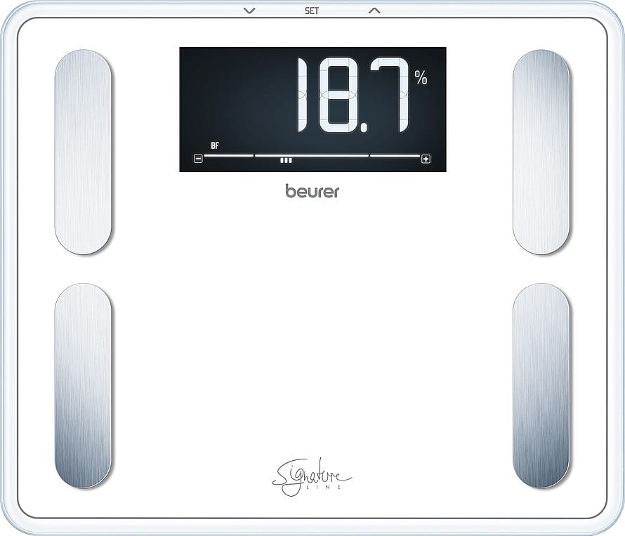 Den hvide kropsanalysevægt BF 410 er en del af Beurer Signature Line, som består af en række personvægte, der alle har Beurers egen font i displayet og alle med en ekstra høj vejekapacitet på 200 kg.