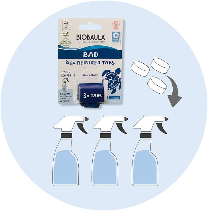 Badrens uden plastik affald - genbrug flasken!Pakken indeholder 3 tabs som opblandet giver 3 flasker badrens à 500-750 ml.
