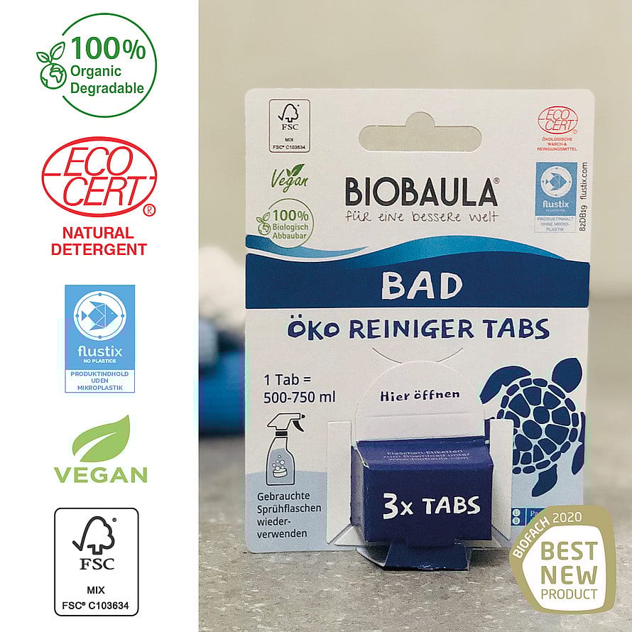 Alle BioBaula produkter er veganske og 100% bionedbrydelige og er certificerede med Ecocert, Flustix og FSC. De indeholder 100% naturlige ingredienser og efterlader ingen skadelige rester og er derfor særdeles velegnede i hjem med børn og kæledyr.