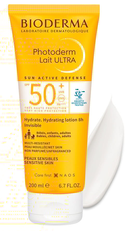 Photoderm Lait ULTRA er BIODERMAs svar på solbeskyttelse til hele familien. Produktet har en meget høj UVA/UVB-beskyttelse og indeholder BIODERMAs SUN ACTIVE DEFENSE, som er en højteknologisk solbeskyttelsesteknologi, der styrker hudens selvbeskyttende kraft. Den eksklusive formel er udviklet til at blive på kroppen og er meget vand-, sved- og sandafvisende. Produktet danner en jævn og stabil film, der fastholder solfilteret på hudens overflade og begrænser spredningen af produktet i havet. Formuleret til at passe til hele familien, selv den mest sensitive hud. Høj hudtolerance. Testet under dermatologisk kontrol.