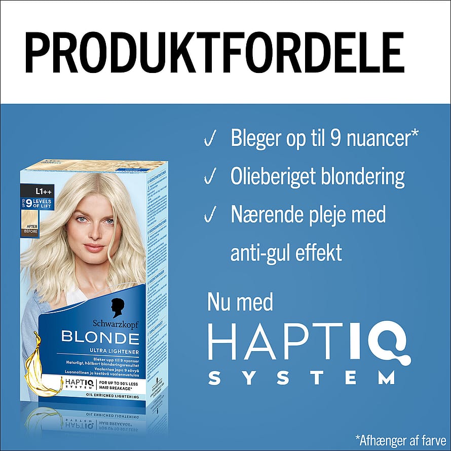 Blonderingscreme/Vaalennusvoide: Aqua (Water, Eau), Octyldodecanol, AmmoniumHydroxide, Ethanolamine, Xanthan Gum, Sodium Gluceptate, Bis-CetearylAmodimethicone, Cellulose Gum, Sodium Laureth Sulfate, Ammonium Sulfate, Parfum(Fragrance), Etidronic Acid, Linalool, Citronellol, Benzyl Alcohol, CI 77007 (Ultramarines)Utvecklings-/Udviklingsemulsion/Kehite-emulsio: Aqua (Water, Eau), Hydrogen Peroxide ·Isopropyl Myristate, Cetearyl Alcohol, PEG-40 Castor Oil, Ceteareth-20, Sodium CetearylSulfate, Etidronic Acid, Potassium Hydroxide, 2, 6-Dicarboxypyridine, DisodiumPyrophosphate, Sodium SulfateBlonderingspulver/Vaalennusjauhe: Potassium Persulfate, Sodium Silicate, SodiumPersulfate, Ammonium Persulfate, Aqua (Water, Eau), Disodium EDTA, Paraffinum Liquidum(Mineral Oil, Huile Minérale), Silica, Potassium Sulfate, Ammonium Sulfate, Sodium SulfateBlonde conditioner/-hoitoaine: Aqua (Water, Eau), Cetearyl Alcohol, BehentrimoniumChloride, Paraffinum Liquidum (Mineral Oil, Huile Minérale), Dimethicone, GuarHydroxypropyltrimonium Chloride, Ceteareth-20, Cetrimonium Chloride, Isopropyl Alcohol ·Phenoxyethanol, Parfum (Fragrance), Potassium Phosphate, Prunus Armeniaca (Apricot)Kernel Oil, Niacinamide, Panthenol, Methylparaben ·Benzophenone-4, Carbomer, Linalool, Potassium Hydroxide ·Laureth-23, Laureth-4, Benzyl Salicylate, Sodium Chloride ·Limonene, Benzyl Alcohol, Hexyl Cinnamal, Hydrolyzed Keratin ·Sodium Salicylate, Acid Violet
