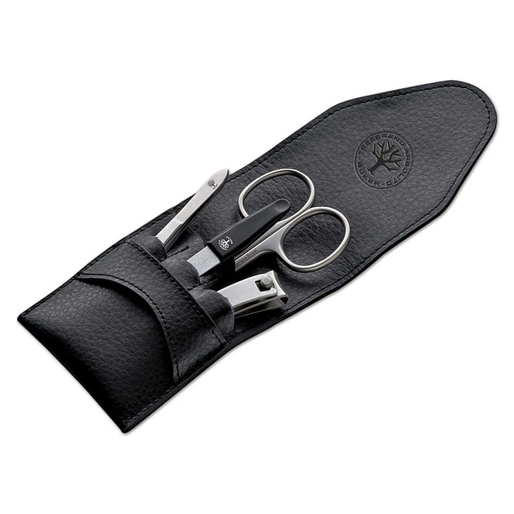 Lækkert manicuresæt til mænd med de mest nødvendige dele. Tyske kvalitetsprodukter fra Solingen, produceret af rustfrit stål og med en ædel og mat overfladefinish. Indeholder 4 dele, hhv. neglesaks, pincet, neglefil og negleklipper. Elegant lille etui af førsteklasses okselæder.