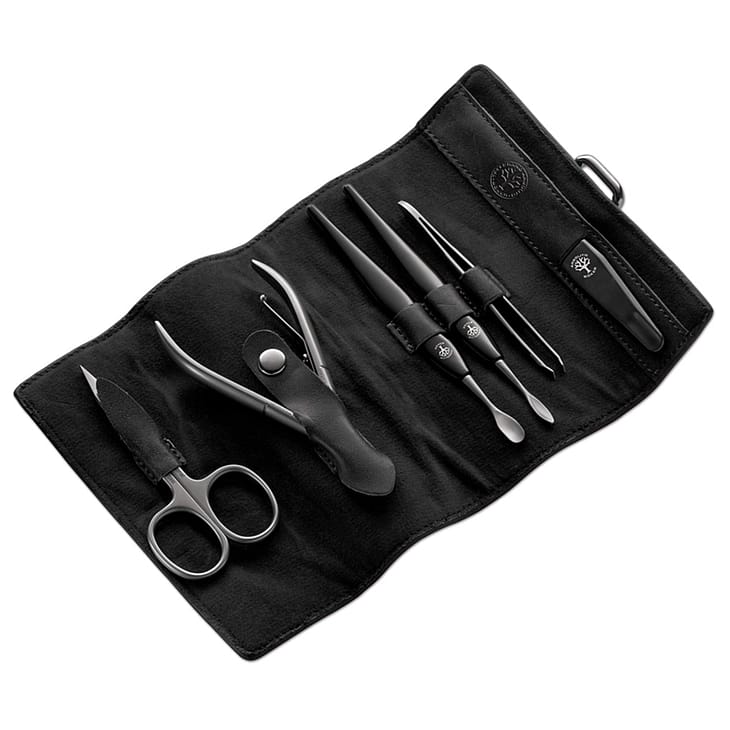 Lækkert manicuresæt til mænd. Tyske kvalitetsprodukter fra Solingen, produceret af rustfrit stål og med en ædel og mat overfladefinish. Indeholder 6 dele, hhv. neglesaks, pincet, neglefil, hudtang, neglekniv og neglebåndskubber. Elegant lille etui af førsteklasses okselæder. Indhold i æsken: