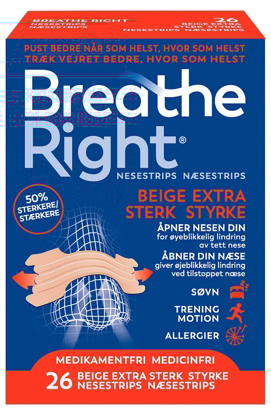 Breathe Right® Næsestrips er fleksible fjederlignende bånd som skånsomt løfter og åbner næsen, så luften bedre kan passere. Breathe Right® Næsestrips er uden lægemiddel og klinisk bevist til straks at åbne næsen, så du lettere kan trække vejret.