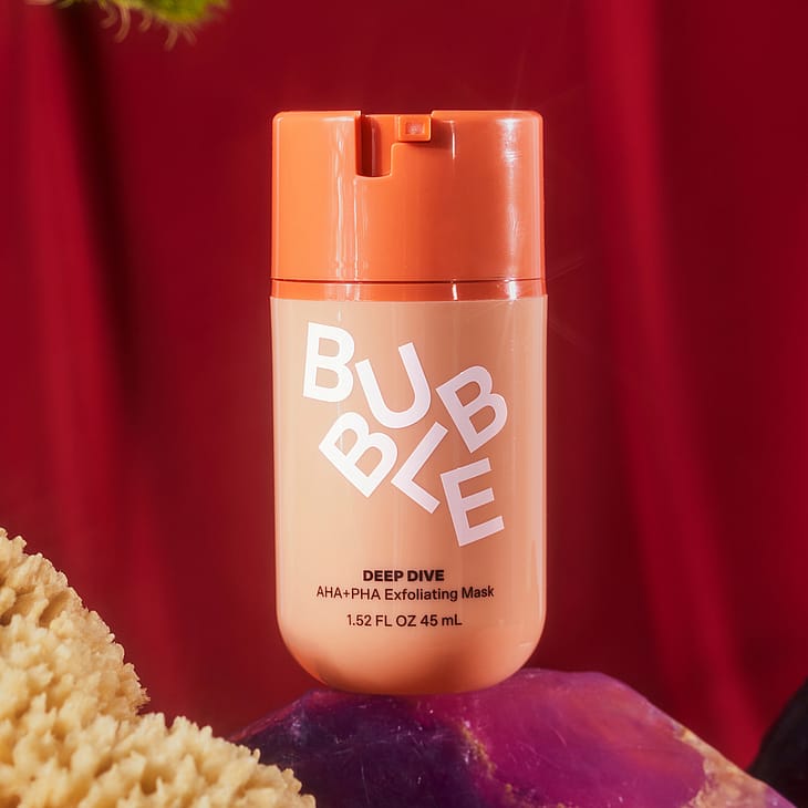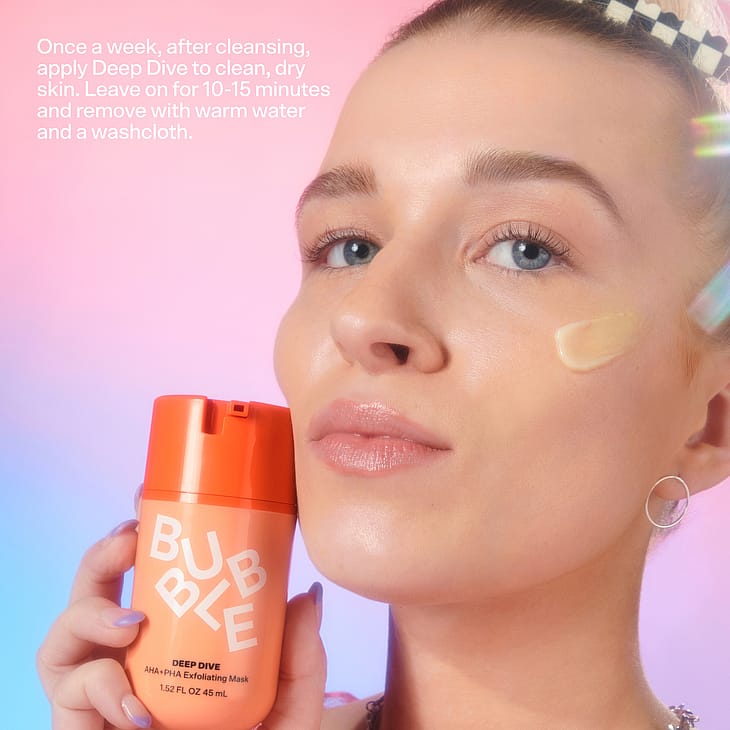 Bubbles Deep Dive eksfolierende maske er en kraftfuld ansigtsblanding med frugtenzymer og alfahydroxysyrer, der arbejder ned i porerne og på overfladen for at give en blødere, glattere og mere jævn hud.