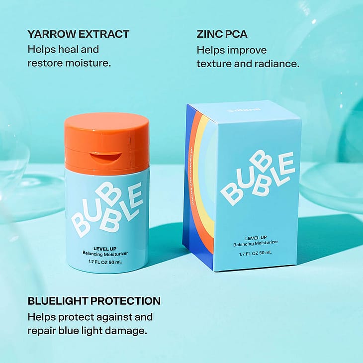 Bubbles Level Up Balancing Moisturizer er en revitaliserende daglig gel-fugtighedscreme, der giver let, glansfri fugt og efterlader huden hydreret, behagelig og frisk.
