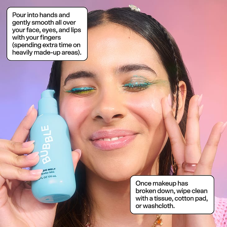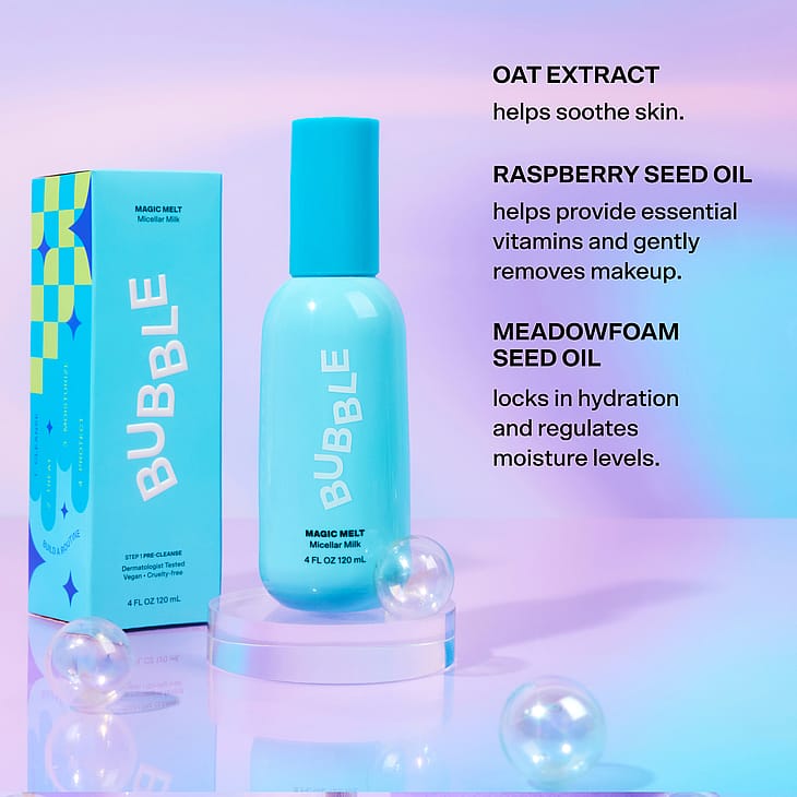 Bubbles Magic Melt Micellar Milk fjerner blidt makeup, olie og SPF for at give en rolig og næret hud. Den bløde, mælkeagtige tekstur er ideel til tørre/følsomme ansigter, og den tørres nemt af med en klud eller en genanvendelig makeup-pude. Brug Magic Melt alene eller som det første trin i en dobbeltrens (eller tredobbelt).