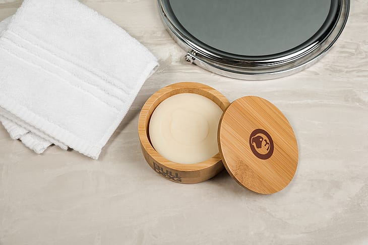 Bulldog Original Shave Soap er en barbersæbe i en stilfuld og holdbar bambusskål.