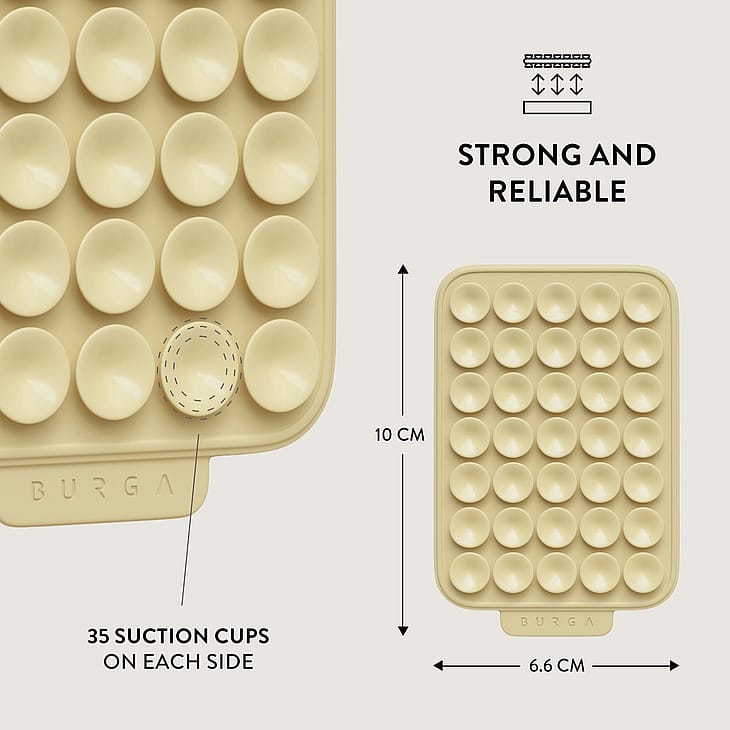 Med 35 sugekopper på hver side holder den din telefon sikkert fast på glatte, ikke-porøse overflader i op til 3 timer på blanke og 1,5 timer på halvblanke overflader.