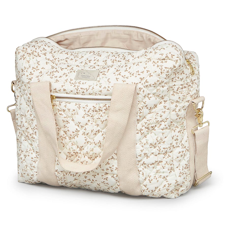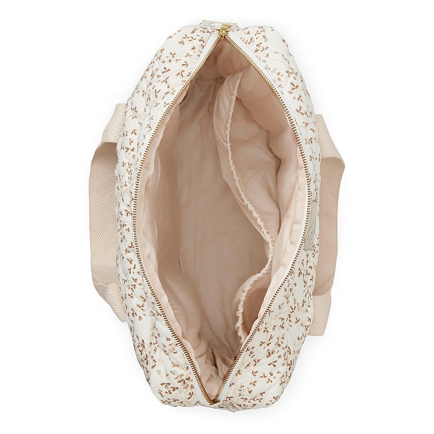 Der medfølger to små stropper, så du kan fastgøre Pusletasken til styret på barnevognen eller klapvognen. Pusletaske i hvide og brune nuancer.