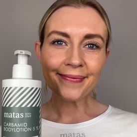 Matas Carbamid Bodylotion 5 % er en intensivt plejende lotion til meget tør og fortykket hud, der blødgør og giver masser af fugt.