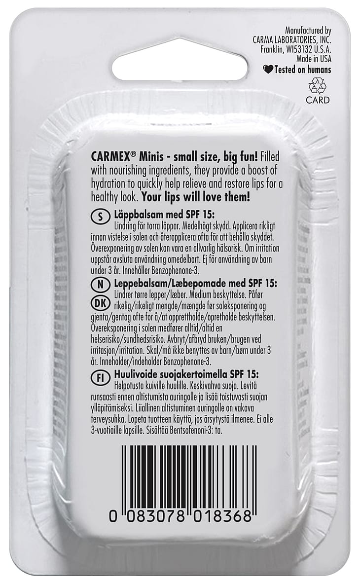 Theobroma Cacao Seed Butter, Benzophenone-3, Paraffinum Liquidum, BHT, Campor, Menthol, Stevia Rebaudiana Extract, Tocopherol. Cherry Tube Ingredients: Petrolatum, Lanolin, Ethylhexyl Methoxycinnamate, Cera Alba, Cetyl Esters, Theobroma Cacao Seed Butter, Benzophenone-3, Paraffinum Liquidum, Aroma, BHT, Camphor, Menthol, Stevia Rebaudiana Extract, Tocopherol, Cinnamal, Eugenol. Pineapple Mint Tube Ingredients: Petrolatum, Lanolin, Ethylhexyl Methoxycinnamate, Aroma, Cera Alba, Cetyl Esters, Theobroma Cacao Seed Butter, Benzophenone-3, Paraffinum Liquidum, Benzyl Benzoate, BHT, Camphor, Menthol, Stevia Rebaudiana Extract, Tocopherol, Limonene, Linalool.