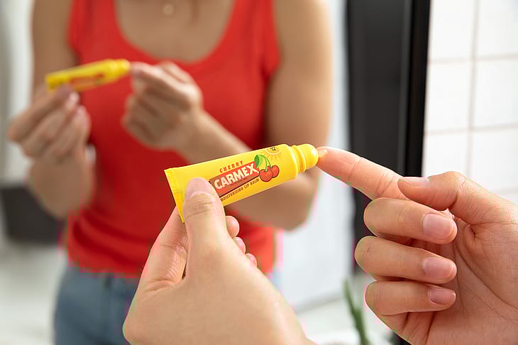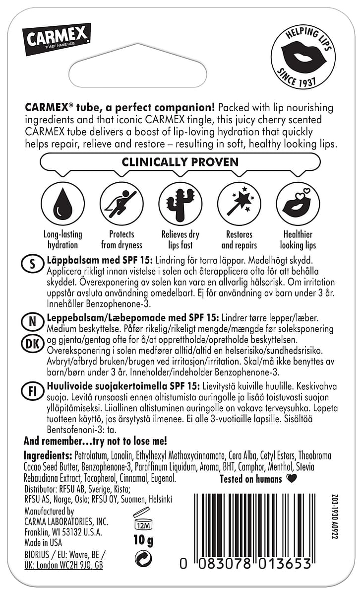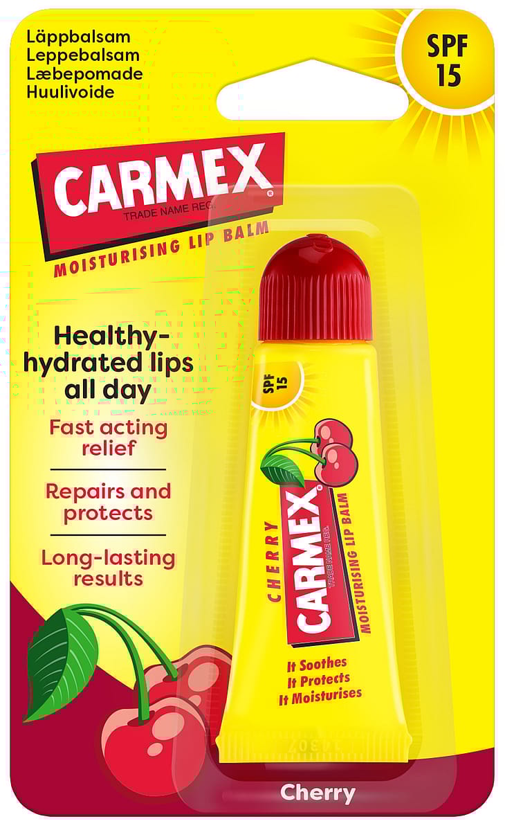 Tube med kirsebærsmag - Den originale medicinske læbepomade med SPF 15. Carmex prisvindende læbepomade har en lækker, rig konsistens, der trænger hurtigt ind uden at fedte.
