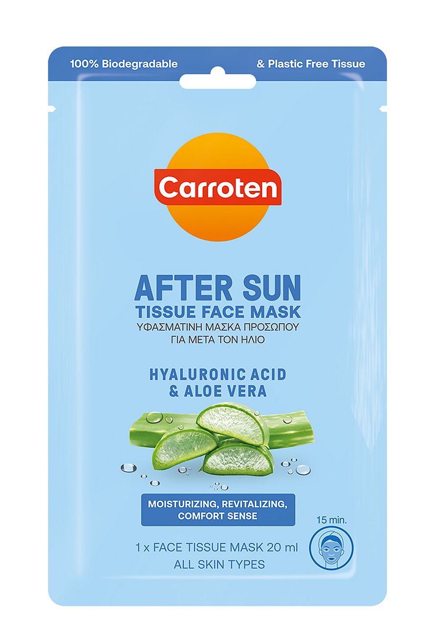 Must have Carroten after sun tissue-maske med aloe vera og hyaluronsyre hjælper øjeblikkeligt med at lindre soleksponeret hud og giver effektiv hydrering, genopretter tabt fugt og bevarer hudens udstråling.