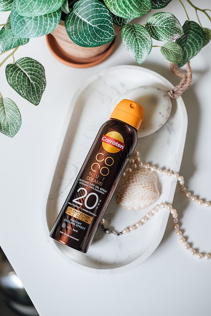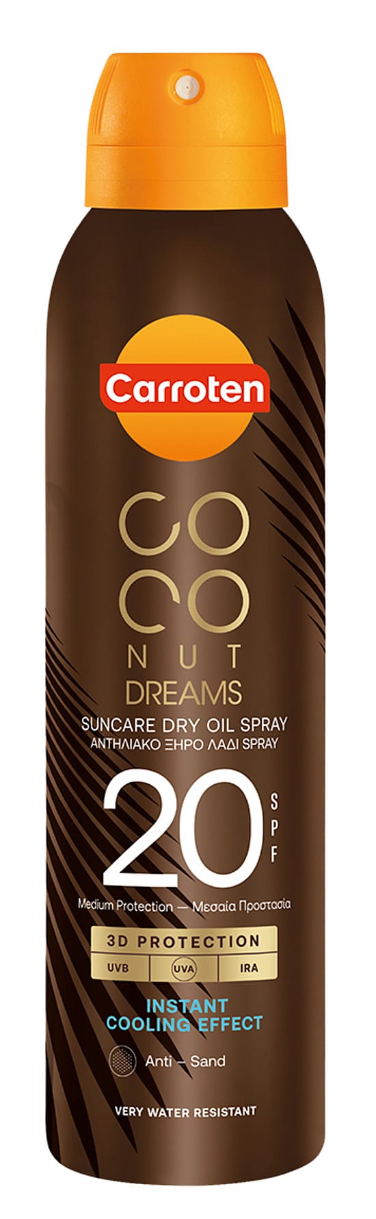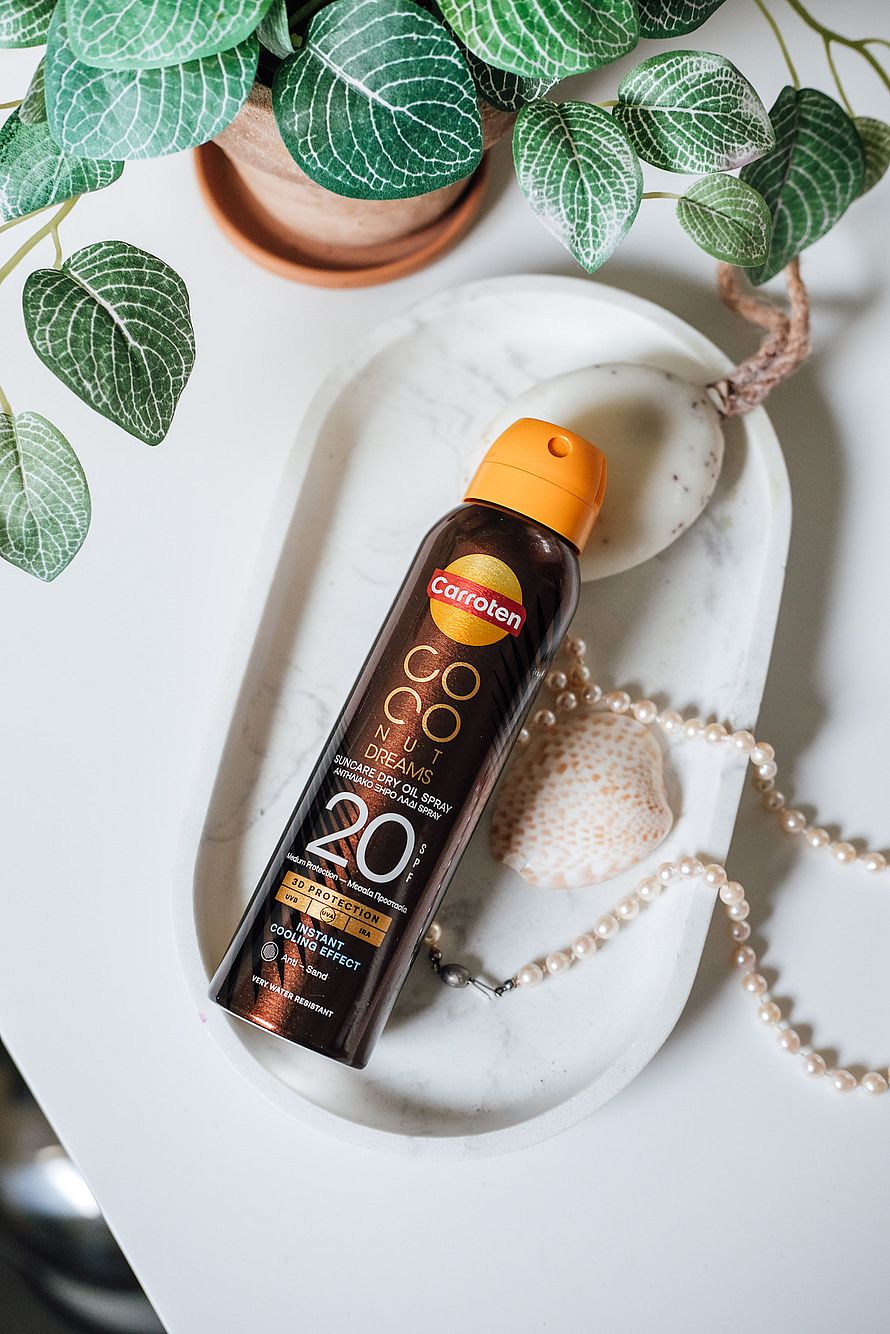 Coconut Dreams Suncare Dry Oil SPF 20 med 360° spraysystem for nem påføring fra alle vinkler.