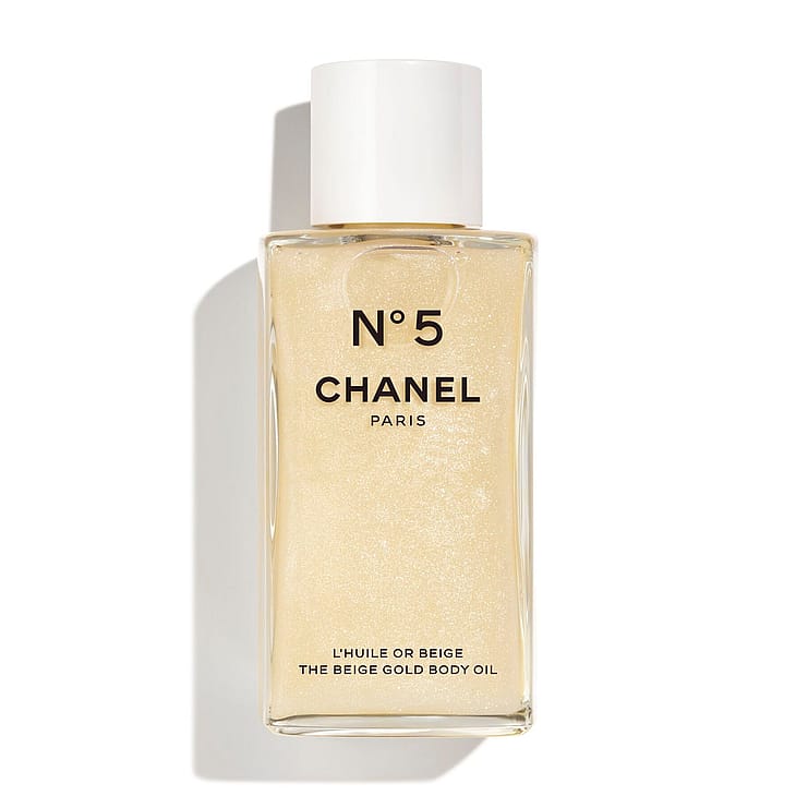 N°5 L’HUILE OR BEIGE er en glitrende olie, der gør huden smukkere og vækker sanserne. Dens flakon i det ekstremt enkle design indkapsler perlemorspartikler i beige-gyldne nuancer, som er en signaturfarve for CHANEL. Dens fyldige formel efterlader huden lige så blød som et silkeslør og med den sensuelle signatur af N°5. Et begrænset oplag i stort format. Påfør rigeligt med L’HUILE OR BEIGE på hele kroppen for at tilføre varig fugt og forlænge duftens sillage. Dens indhyllende tekstur lyser huden op med en beige-gylden glød.