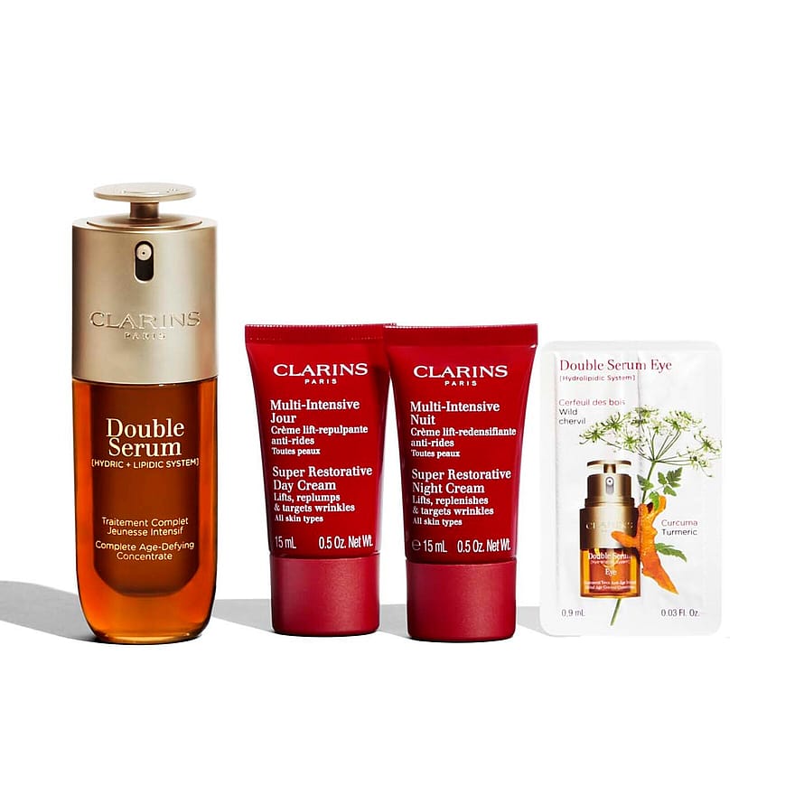 Det genopbyggende hudplejesæt til hud, der er svækket af aldersrelaterede hormonelle forandringer: den ikoniske Double Serum med 27 planteekstrakter og en duo af genopbyggende og udglattende anti-ageing dag- og natcremer med harungana ekstrakt.