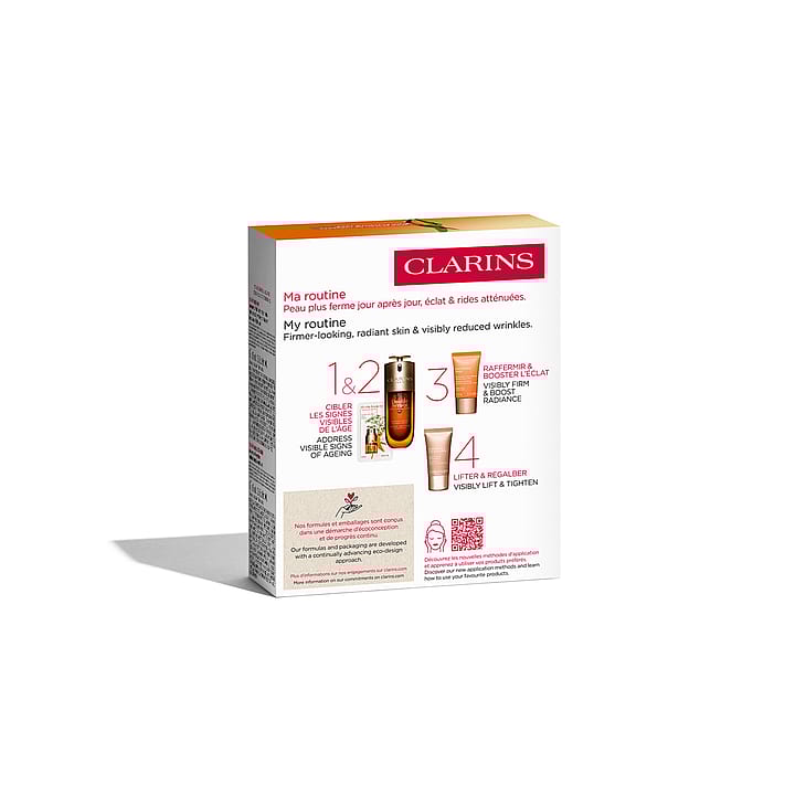 Antirynke- og opstrammende hudplejesæt til kvinder, der ønsker et synligt yngre, glattere, fastere og, mere løftet hud. Først Double Serum Eye til øjnene, som hjælper med at reducere rynker og opstrammer den sarte hud omkring øjnene. Derefter den ikoniske Double Serum, der er formuleret med 27 planteekstrakter, som er målrettet mod tegn på aldring.
