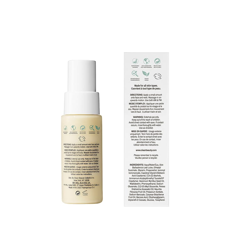 Aqua/Water/Eau, Aloe Barbadensis Leaf Juice, Diheptyl Succinate, Glycerin, Propanediol, Isononyl Isononanoate, Capryloyl Glycerin/Sebacic Acid Copolymer, C14-22 Alcohols, Ammonium Acryloyldimethyl Taurate/VP Copolymer, Vaccinium Myrtillus Seed Oil, Maltodextrin, Phenoxyethanol, Sodium Gluconate, C12-20 Alkyl Glucoside, Persea Gratissima (Avocado) Oil, Mauritia Flexuosa Fruit Oil, Potassium Sorbate, Sodium Benzoate, Caryocar Brasiliense Fruit Oil, Benzoic Acid, Ethylhexylglycerin, Glycereth-2 Cocoate, Glucose, Tocopherol.