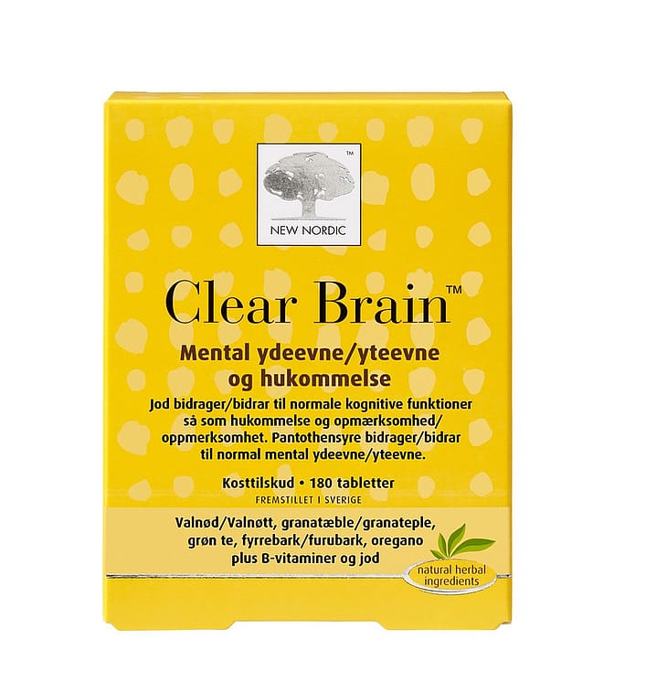 Kosttilskud. Clear Brain er baseret på ekstrakter af valnød, granatæble, fyrrebark, grøn te, peber samt vitaminer og mineraler.