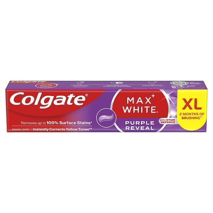 Colgate Max White Purple Reveal Whitening tandpasta har optisk farvekorrigerende teknologi, som lader dig afsløre dit hvidere smil fra den første tandbørstning.